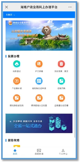 一、湖南户籍居民可微信关注“湖南公安服务平台”公众号,注册并实人认证登录,点击“微警务”,进入平台首页,在热点应用栏中选择“户口业务全程网办”,