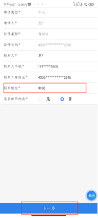 10.基本信息自动获取后,填写好联系地址,点击“下一步” |