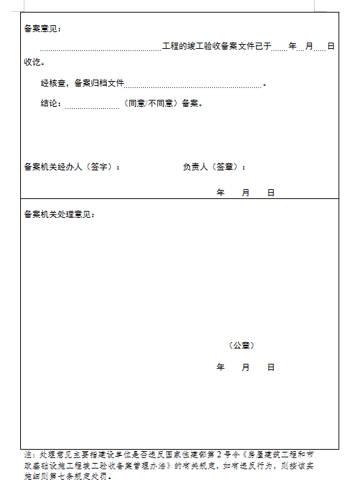 3、《湖南省房屋建筑和市政基础设施工程竣工验收备案管理实施办法》第四条建设单位在工程竣工验收合格之日起15日内,通过湖南省建设工程项目审批管理系统办理工程竣工验收备案手续。