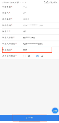 9.基本信息自动获取后,填写好联系地址,点击“下一步” |
