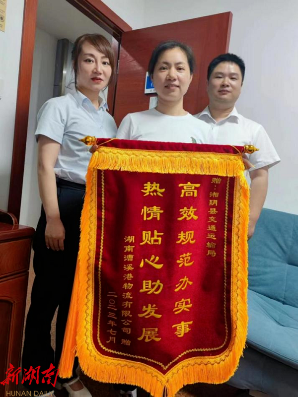 湖南日报·新湖南客户端8月18日讯 日前,湖南漕溪港物流有限公司易女士将印有“高效贴心办实事,热情贴心助发展”的锦旗送到湘阴县交通运输行政审批后室工作人员手中,感谢工作人员办事快捷效率。