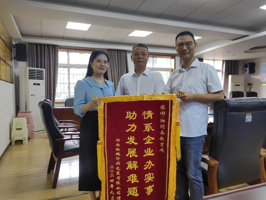 湖南日报·新湖南客户端9月14日讯(通讯员 赵蓉)“感谢教育局的惠企政策,帮助企业消除职工后顾之忧,我的两个孩子都从长沙转到了湘阴,工作和生活都能兼顾好了……”9月14日,湖南裕鹏印刷包装有限公司负责人向湘阴县教育局送来锦旗表示感谢。