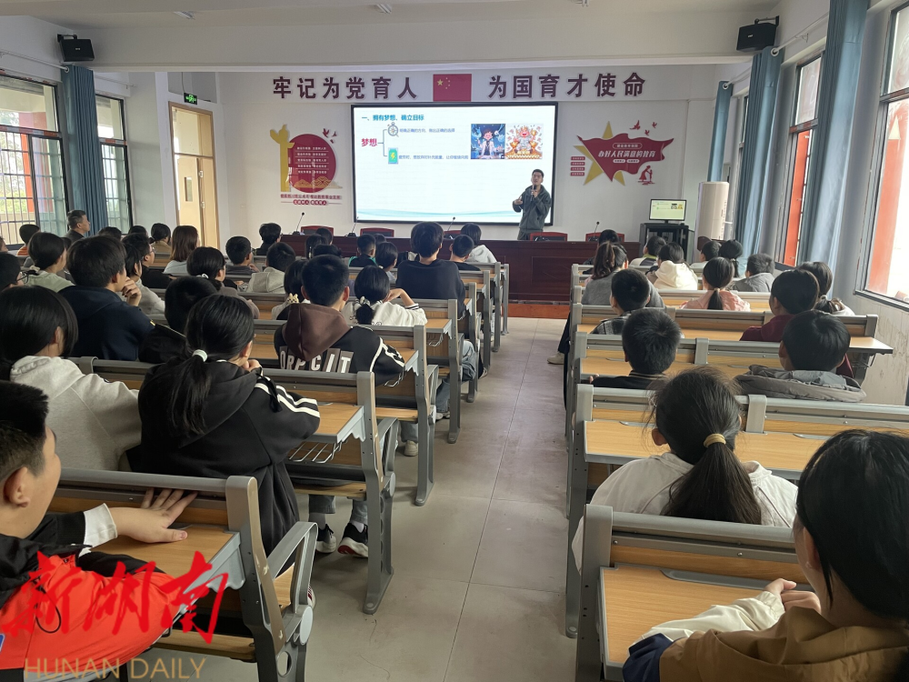 在湘滨镇洞庭中学会议室,省委2025届选调生游景明、张星以《树立远大志向,克服当前困难》及《英语学习之光 》为题,为该校初中生讲述励志故事,分享自身经历,鼓励孩子们成为社会栋梁,为祖国强盛贡献力量。