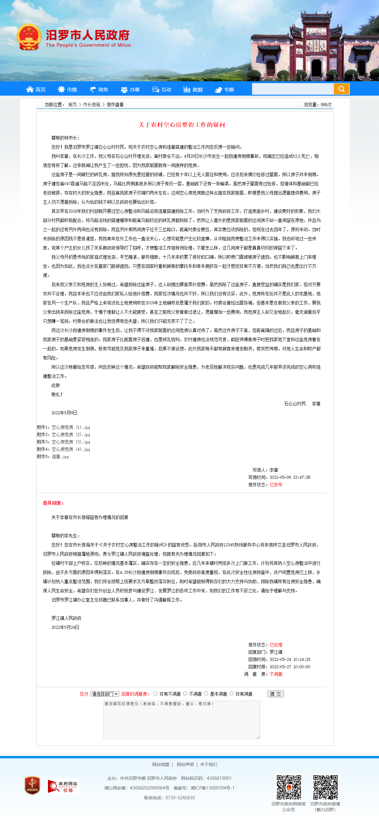 经过两个多星期后,罗江镇政府办公室才回复我已经记录该危房,需要对罗江镇整体危房进行排查,7月初开始整治。而现在7月已经进入下旬,各方面均未见到任何措施和回复,现在我再次向汨罗市政府投诉此事,我对结果很不满意。