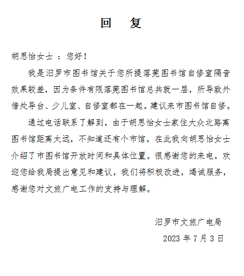 我是一名刚毕业到汨罗参加工作的年轻同志,周末喜欢去图书馆自修,汨罗环境比较好的是落篼图书馆,但是因为小朋友的阅读室和咨询台还有自修室都在同一层,隔音效果不佳,希望能开放一层成人自修室。