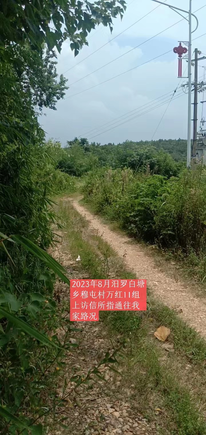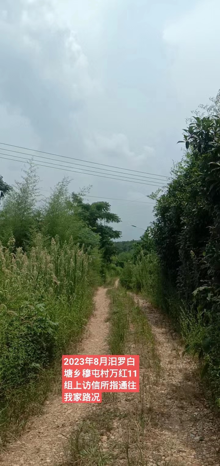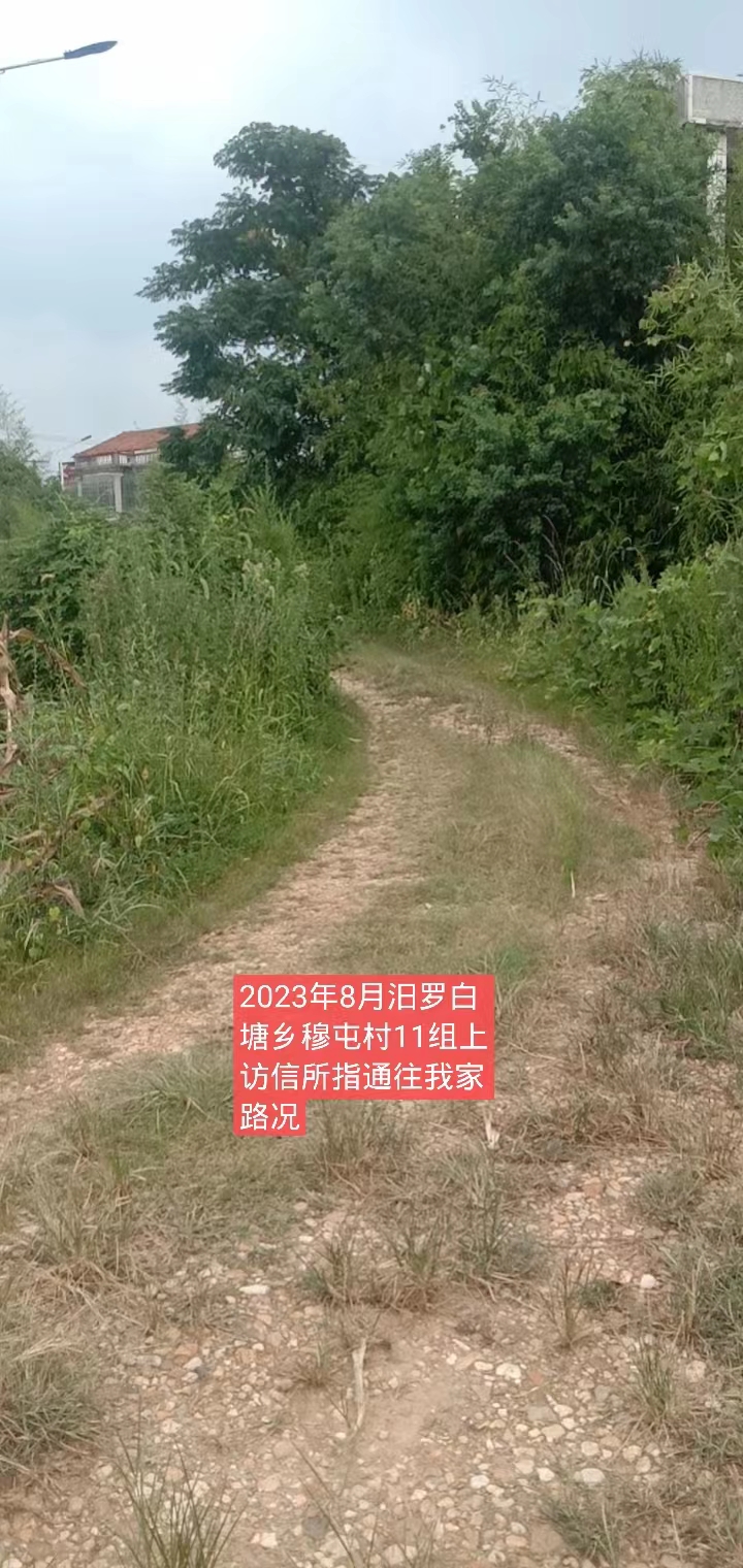 尊敬的市领导: 我是汨罗市白塘乡穆屯村万红11组村民。2014年前后,负责农村土地整形的相关人员未经我家同意,在我家门前坪开挖修渠,导致我家雨水灌注,家具泡水,人、车无法通行,给我家正常的生活起居带来极大困难。我家多次跟村组织反映,但毫无任何回应。无奈之下,只好自己花钱铲除渠道泥土,还原前坪。之所以我家的前坪被开挖,是因为当时项目负责人为了得到政府给的修渠道补偿款而胡乱作为。 另外,当时村组织修路,我家按人头缴纳了相关费用,但我家门前的主路并没有得到任何修理,而其他人家几乎都将水泥路修到了家门口;并且我家门前的路还是我们村组耕种田地的必经之路。现在这条路野树、竹子肆意生长,围拢路的两侧,导致人、车无法通行,下雨天都是泥泞。 为解决以上问题,本人特提出以下两点请求: 1、修通我们家门前的水泥路; 2、补偿2014年前后渠道泥土清理费用。 综上,拜请相关部门为老百姓作主,让国家的利好政策惠及每家每户。 谢谢!