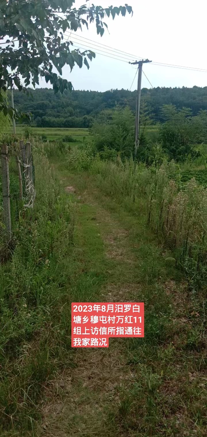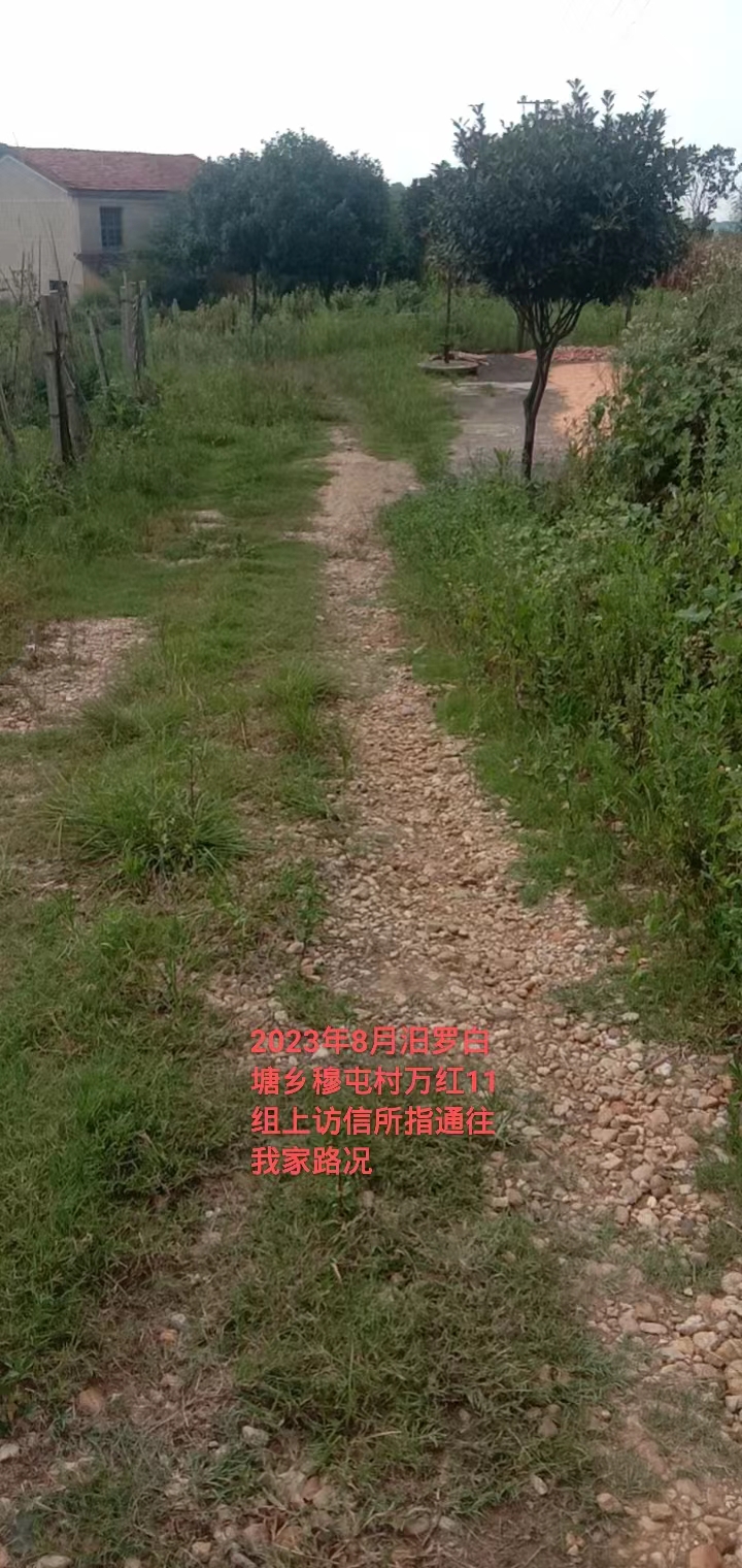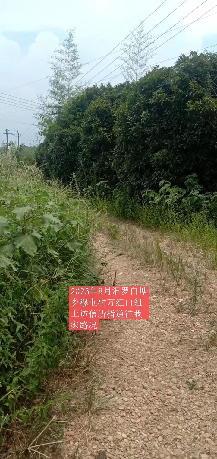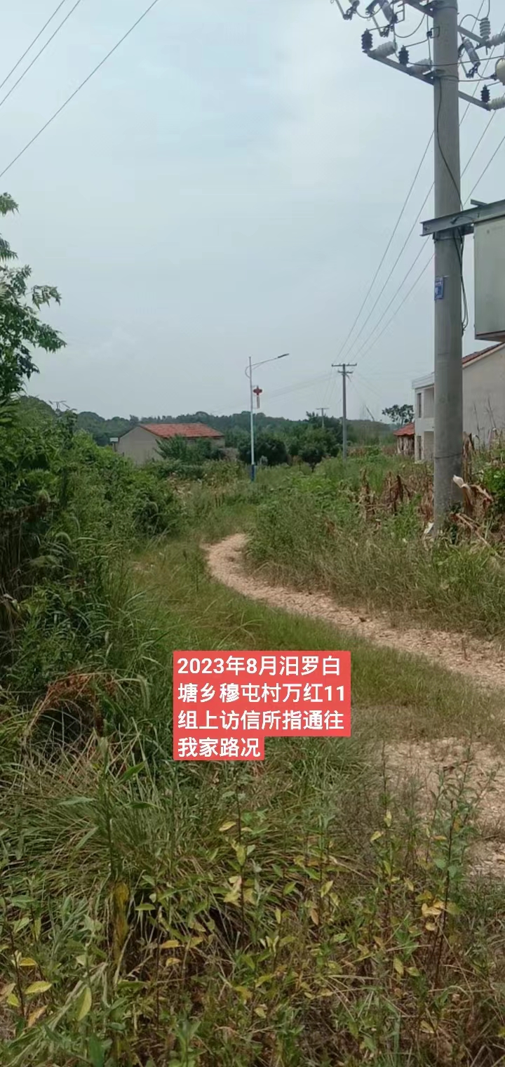 尊敬的市领导: 我是汨罗市白塘乡穆屯村万红11组村民。2014年前后,负责农村土地整形的相关人员未经我家同意,在我家门前坪开挖修渠,导致我家雨水灌注,家具泡水,人、车无法通行,给我家正常的生活起居带来极大困难。我家多次跟村组织反映,但毫无任何回应。无奈之下,只好自己花钱铲除渠道泥土,还原前坪。之所以我家的前坪被开挖,是因为当时项目负责人为了得到政府给的修渠道补偿款而胡乱作为。 另外,当时村组织修路,我家按人头缴纳了相关费用,但我家门前的主路并没有得到任何修理,而其他人家几乎都将水泥路修到了家门口;并且我家门前的路还是我们村组耕种田地的必经之路。现在这条路野树、竹子肆意生长,围拢路的两侧,导致人、车无法通行,下雨天都是泥泞。 为解决以上问题,本人特提出以下两点请求: 1、修通我们家门前的水泥路; 2、补偿2014年前后渠道泥土清理费用。 综上,拜请相关部门为老百姓作主,让国家的利好政策惠及每家每户。 谢谢!