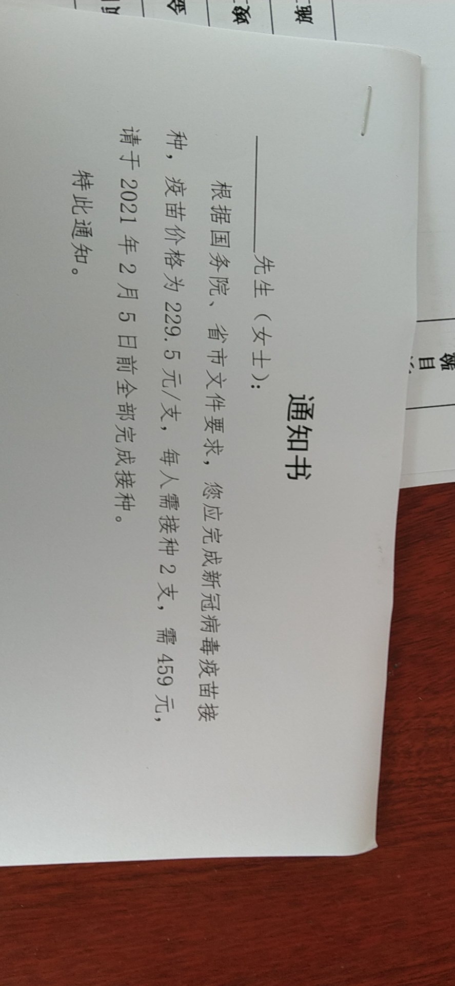 县突发公共卫生事件应急指挥部根据上级文件在2020年12月23日下发了微信群通知,为进一步做好重点人群新型冠状病毒疫苗接种工作,根据国务院、省、市文件和会议有关要求:在知情同意的前提下,全县应完成重点人群(见备注)新冠病毒疫苗接种,要在1月15日前完成全县所有重点人群的首针接种,2月5日前全部完成第二针接种。新冠病毒疫苗价格为229.5元/支(含9.5元冷链运转费,20元接种服务费);每人需接种2支,需459元,接种对象的接种费用由其所在单位(企业)或个人承担。注:重点人群新冠病毒疫苗接种对象具体包括:年龄应为18-59岁之间,因公、因私出国工作、学习人员,医疗卫生人员,政府机关、公安、武警、消防、社区工作者,冷链食品、水、电、暖、煤、气相关人员,交通、物流、养老、环卫、殡葬、通讯相关工作人员。