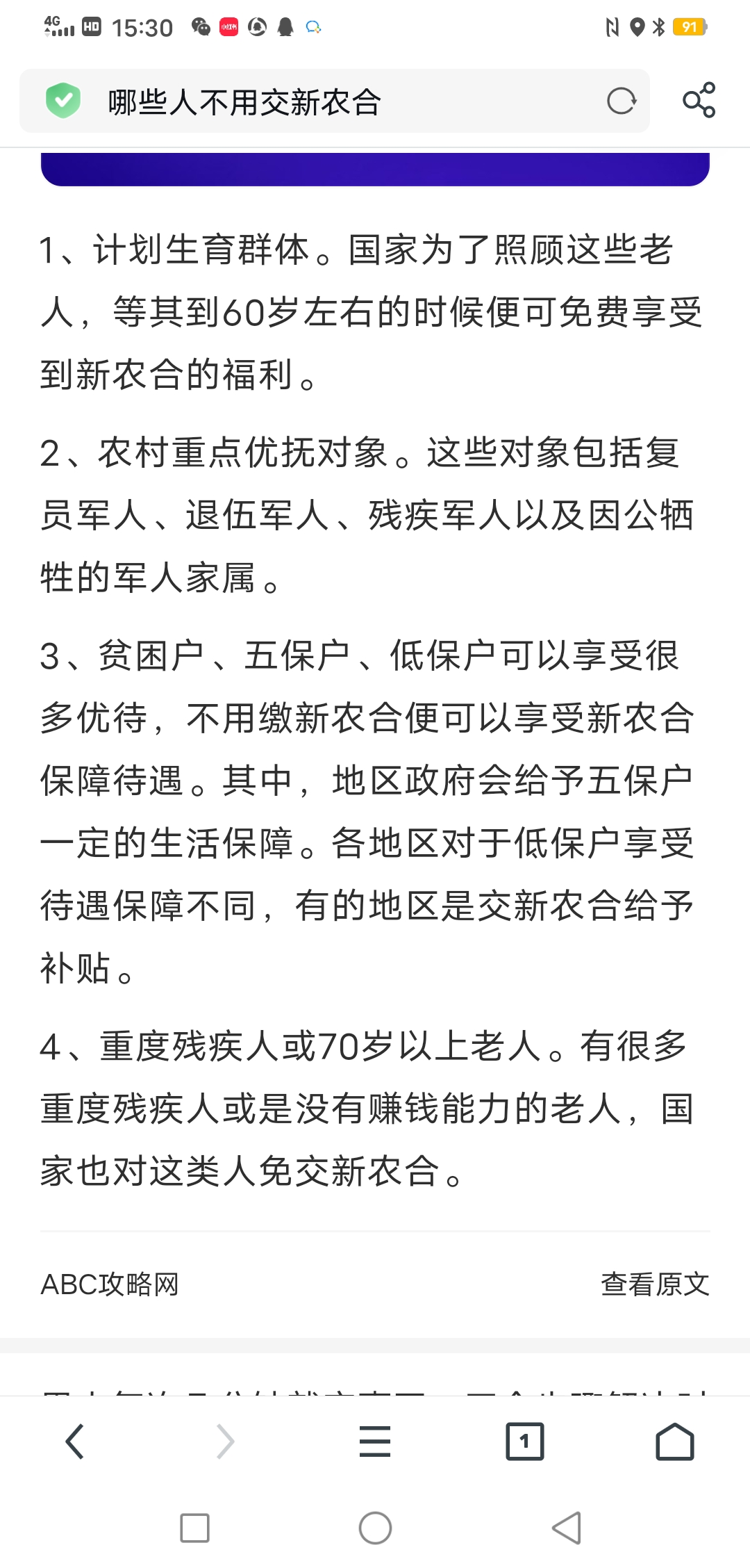 咨询这个的真假 1、计划生育群体。国家为了照顾这些老人,等其到60岁左右的时候便可免费享受到新农合的福利。2、农村重点优抚对象。这些对象包括复员军人、退伍军人、残疾军人以及因公牺牲的军人家属。3、贫困户、五保户、低保户可以享受很多优待,不用缴新农合便可以享受新农合保障待遇。其中,地区政府会给予五保户一定的生活保障。各地区对于低保户享受待遇保障不同,有的地区是交新农合给予补贴。4、重度残疾人或70岁以上老人。有很多重度残疾人或是没有赚钱能力的老人,国家也对这类人免交新农合。