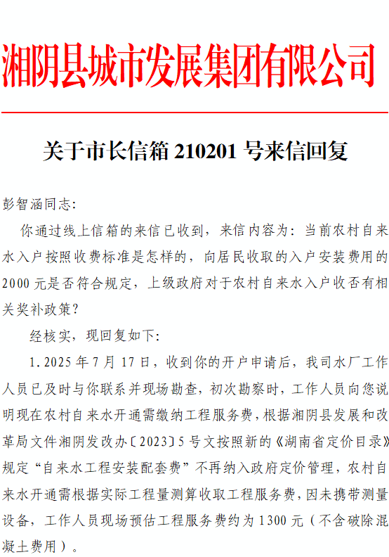 关于农村居民自来水入户安装问题咨询 湘阴县政府: 我是新泉镇车马江社区一名居民,因家中需要安装自来水,家中老人联系自来水厂人员上门勘察,了解到自来水入户安装需要费用约2000元。我对于自来水安装有相关问题咨询如下。 农村居民自来水工程是方便农村居民用户饮水,保障农村居民饮水健康的重要民生工程。当前农村自来水入户按照收费标准是怎样的,向居民收取的入户安装费用的2000元是否符合规定,上级政府对于农村自来水入户收否有相关奖补政策? 望给予支持回复为盼。