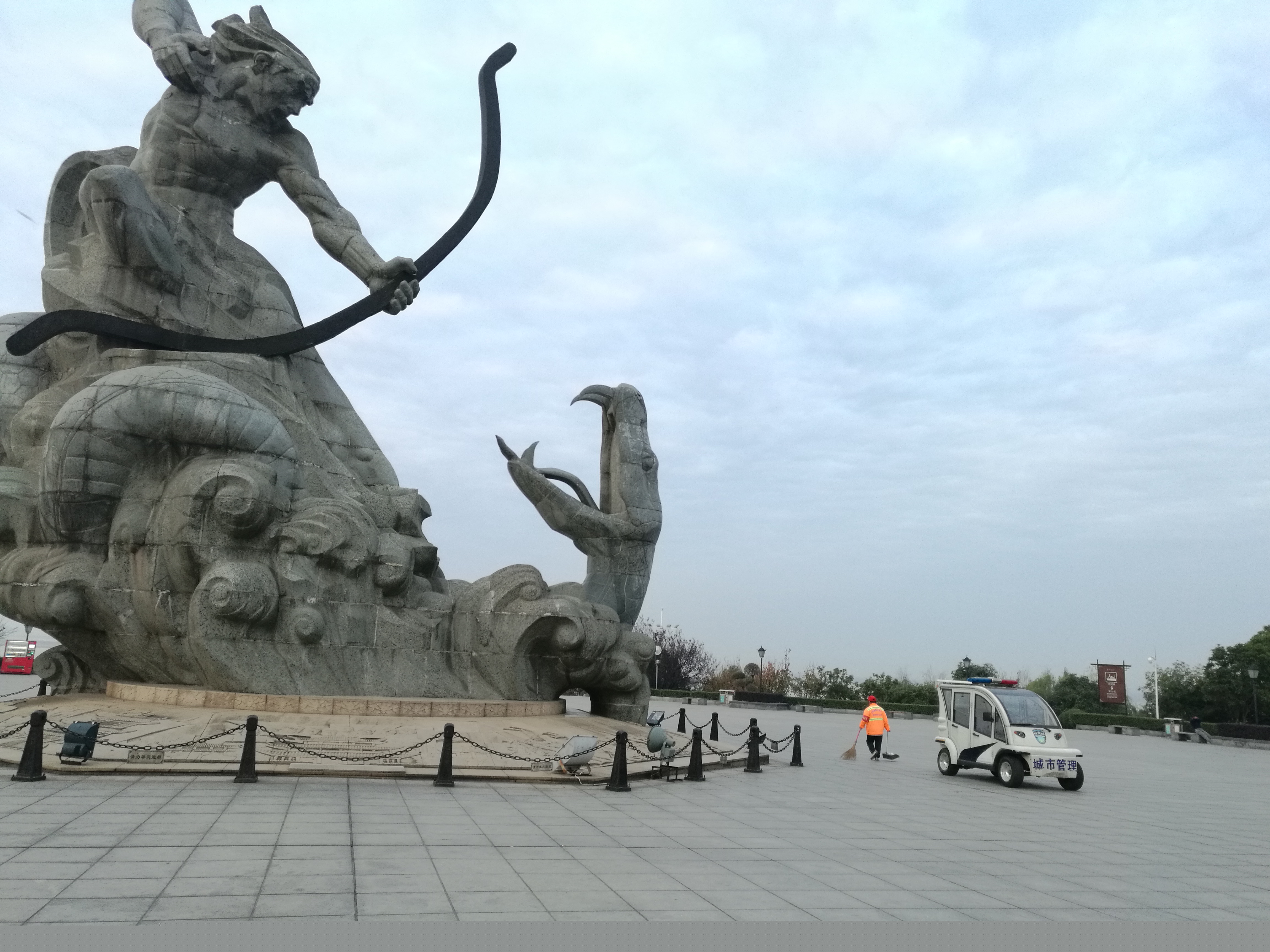 我每天都要来巴陵广场晨练。自两月前开始,发现有一台标志为城市管理的四轮电瓶车停放在后羿射巴蛇的雕塑前,与巴蛇比肩而立。开始几天,我没在意,时间长了,此车在此纹丝不动。心生疑惑了:难道这车也成了广场一景?不应该呀?