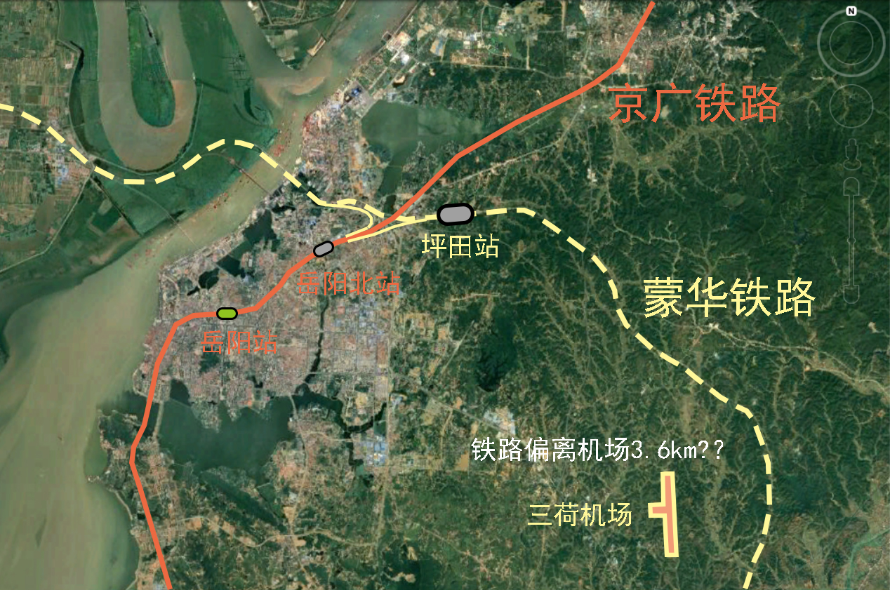 我认为尽可能提高空铁水吞吐量与中转便捷度,是促进岳阳建设国家区域中心城市(中部十三五规划文件)的重要一环。如果可能,可以沟通铁路局,让部分客车、货车停靠三荷站(岳阳火车站/岳阳北站—三荷机场站)。但从最新卫星图上测量,蒙华铁路开建线路,似乎已经从东侧绕开了机场约3.7 km。