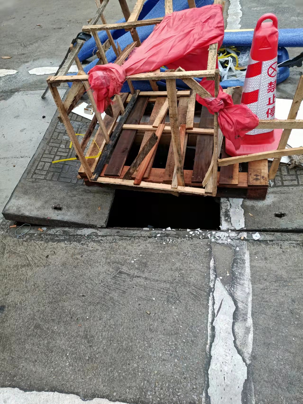 亚华大市场大门口右侧,地下电信大井盖,被车压断有一星期了,坑内有很深的积水,有严重的安全隐患。建议相关部门尽快处理,消除隐患。