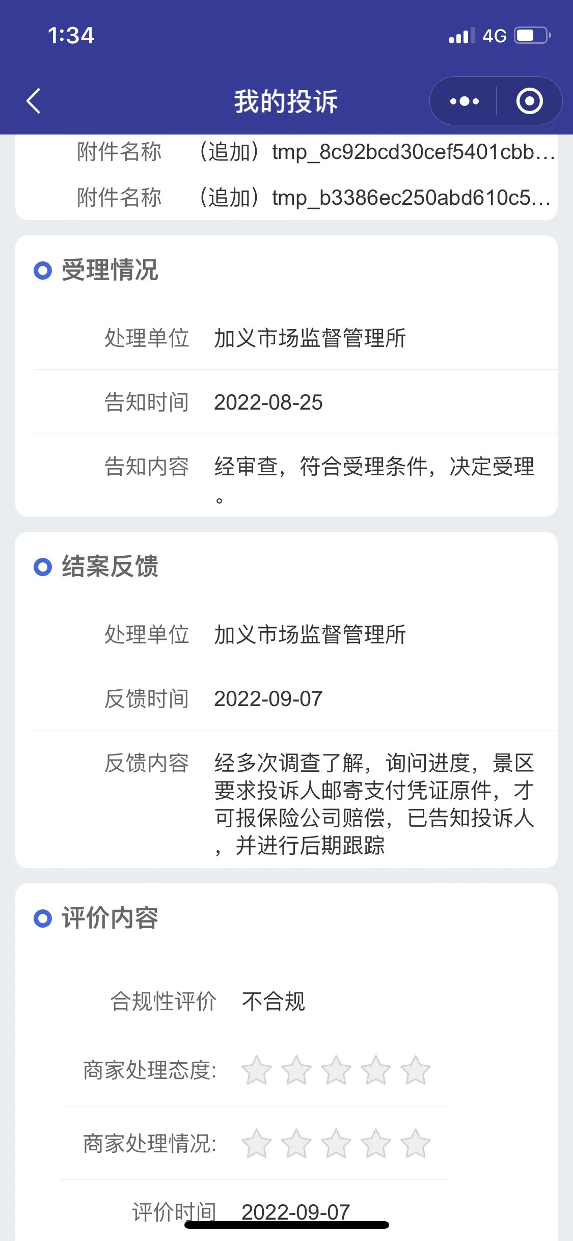 加义镇信访办在收到您的诉求后,第一时间将该事情反馈至加义镇分管旅游的主管领导和相关部门,9月26日,经加义镇旅游办工作人员与纯溪小镇景区负责人对接了解,在此次事件发生后的处理过程中,因景区支付赔偿款需要发票原件,而您提供的是发票复印件,因此耽误了赔付时间。经过旅游办工作人员的积极对接,相关赔偿款已于9月26日赔付到位。针对该事项的相关处理过程和处理结果,加义镇信访办已于9月27日上午和您电话沟通并告知,您表示对办理结果无异议。