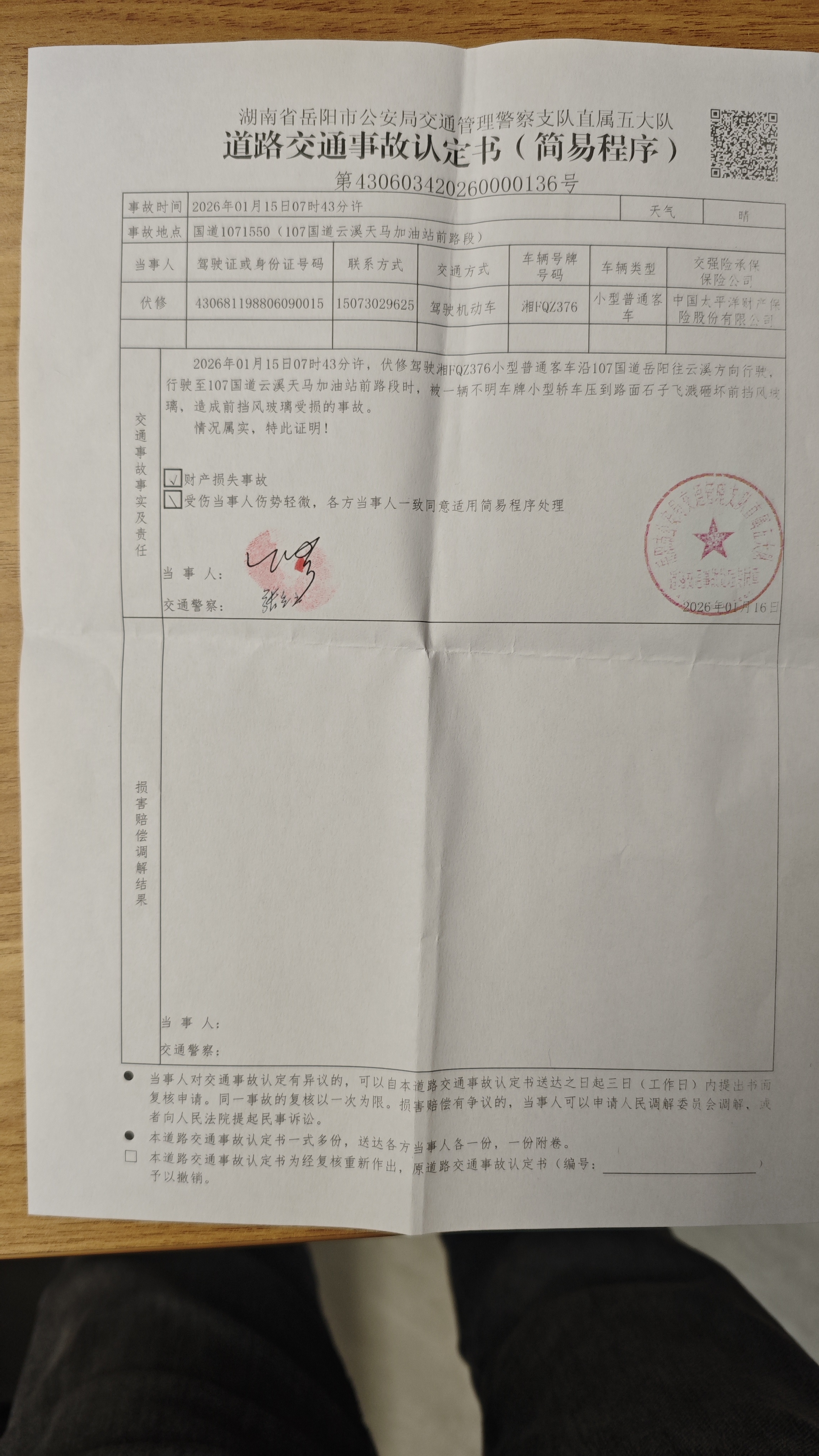 我系车牌号为湘FQZ376小型普通客车的车主。2026年1月15日7时43分许,本人驾驶该车辆沿107国道自岳阳往云溪方向正常行驶。途经107国道天马加油站前路段时,前方一辆湘F牌照小型普通客车碾压到路面遗落石子,致石子飞溅击中本人车辆前挡风玻璃,造成玻璃受损。