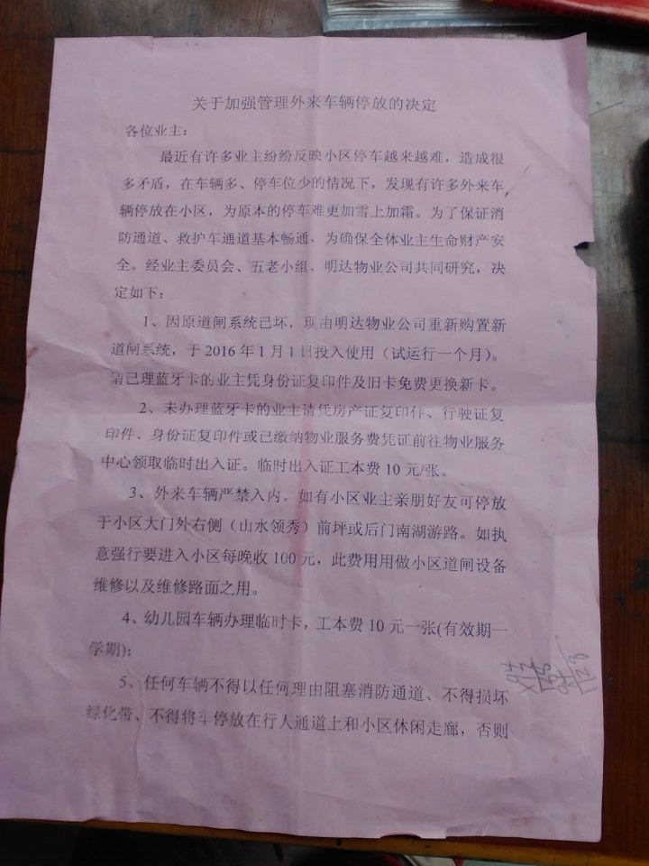 2、“决定”上说明是通过小区业主委员会的商讨决定。但是其“决定”并不符合我小区具体情况,并不能实际解决小区停车难的问题。第一、小区实际车位并不够每户一个停车位。第二、小区每户并不只有一台车辆。第三、小区住户有亲人、亲属车辆临时停放并没有解决。