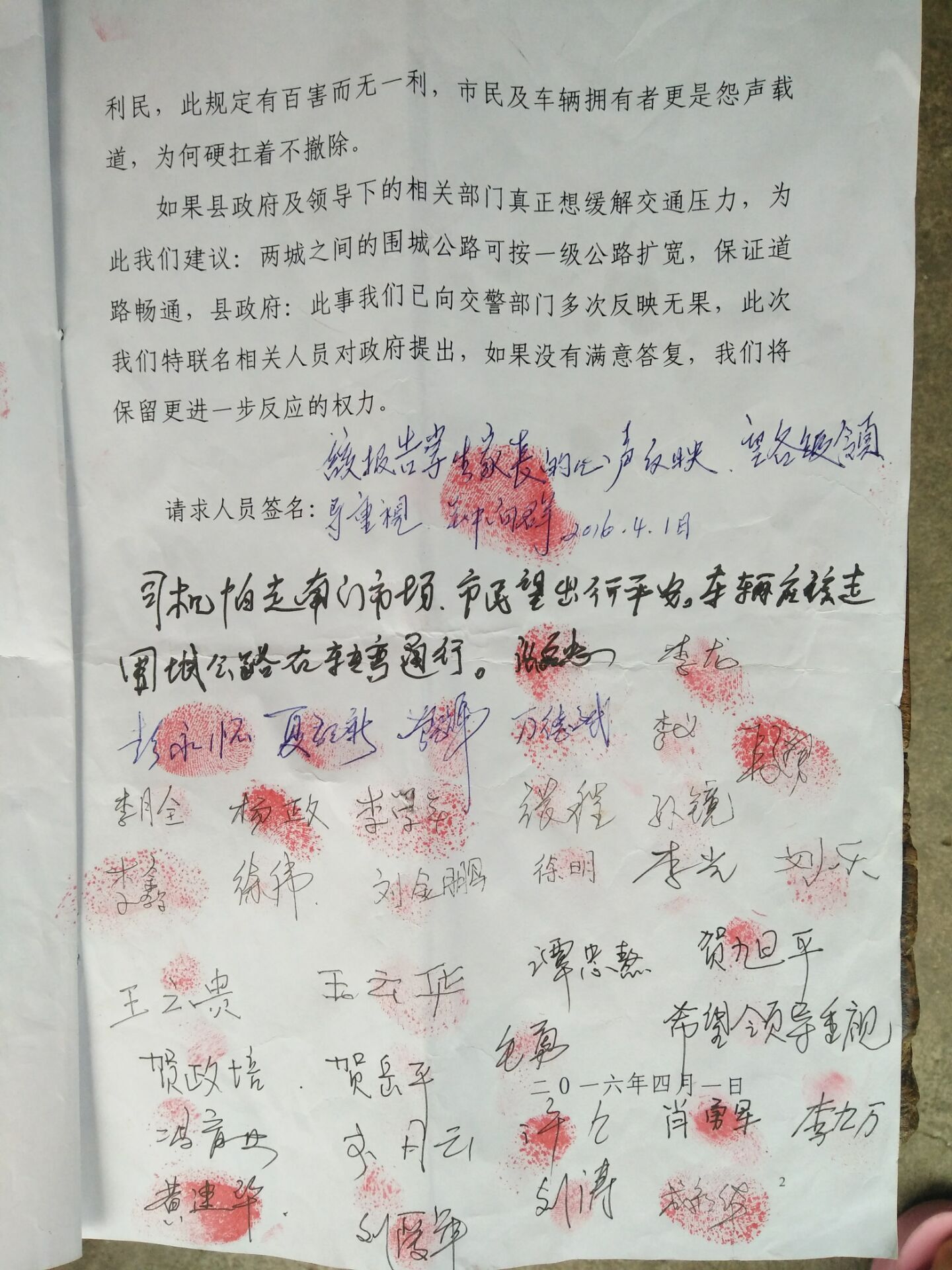 如果华容县政府及领导下的相关部门真正想缓解交通压力,我们建议:两城之间围城公路可按一级公路扩宽,保证道路畅通,县政府:此事我们本地居民、华泰客运公司及治河渡镇政府已向交警部门多次反映无果,此次我们特联名相关人员向市政府提出“关于请求撤销华容县治河渡大桥禁止车辆右转弯及单向行驶的规定的申请”,如果没有满意答复,我们将保留进一步反映的权利。