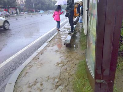 湖南省岳阳市岳阳楼区巴陵东路巴陵一号公交车站烂泥巴站台,那个地方为什么不打上水泥了,尤其是下雨天非常不方便。