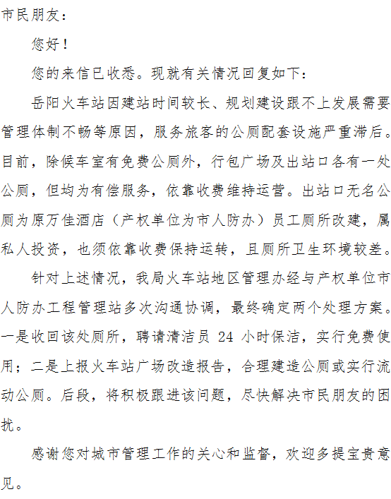 关于岳阳火车站侧边卫生间收费事宜