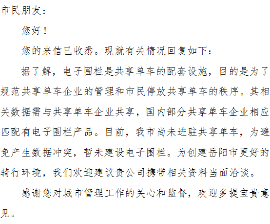 为了进一步规范管理共享单车,广东亦强科技有限公司以《关于鼓励和规范互联网租赁自行车发展的指导意见》(交运发〔2017〕109号)为指导,向岳阳市人民政府提出申请,由我公司全额出资,在岳阳市建设公益性共享单车电子围栏。如获批准,我们将于2017年底建设2000个共享单车电子围栏,并力争在2018年6月,将共享单车电子围栏覆盖岳阳市。协助政府规范管理共享单车,让共享单车更好地为人们提供出行服务,并助力城市交通的建设与发展。