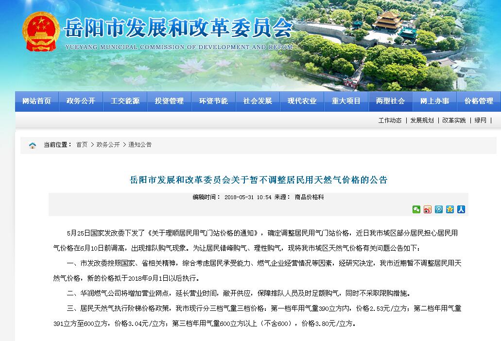 尊敬的燃气用户: 近日国家发改委发布了关于理顺居民用气门站价格的通知,该执行文件调整的居民门站价格并不是居民购买的燃气价格,岳阳市发改委今天也公布了暂不调价的通知。后续如果有调价通知,在得到准确通知后,岳阳华润燃气有限公司会根据政府物价文件第一时间对外公布调价流程和结果。 |