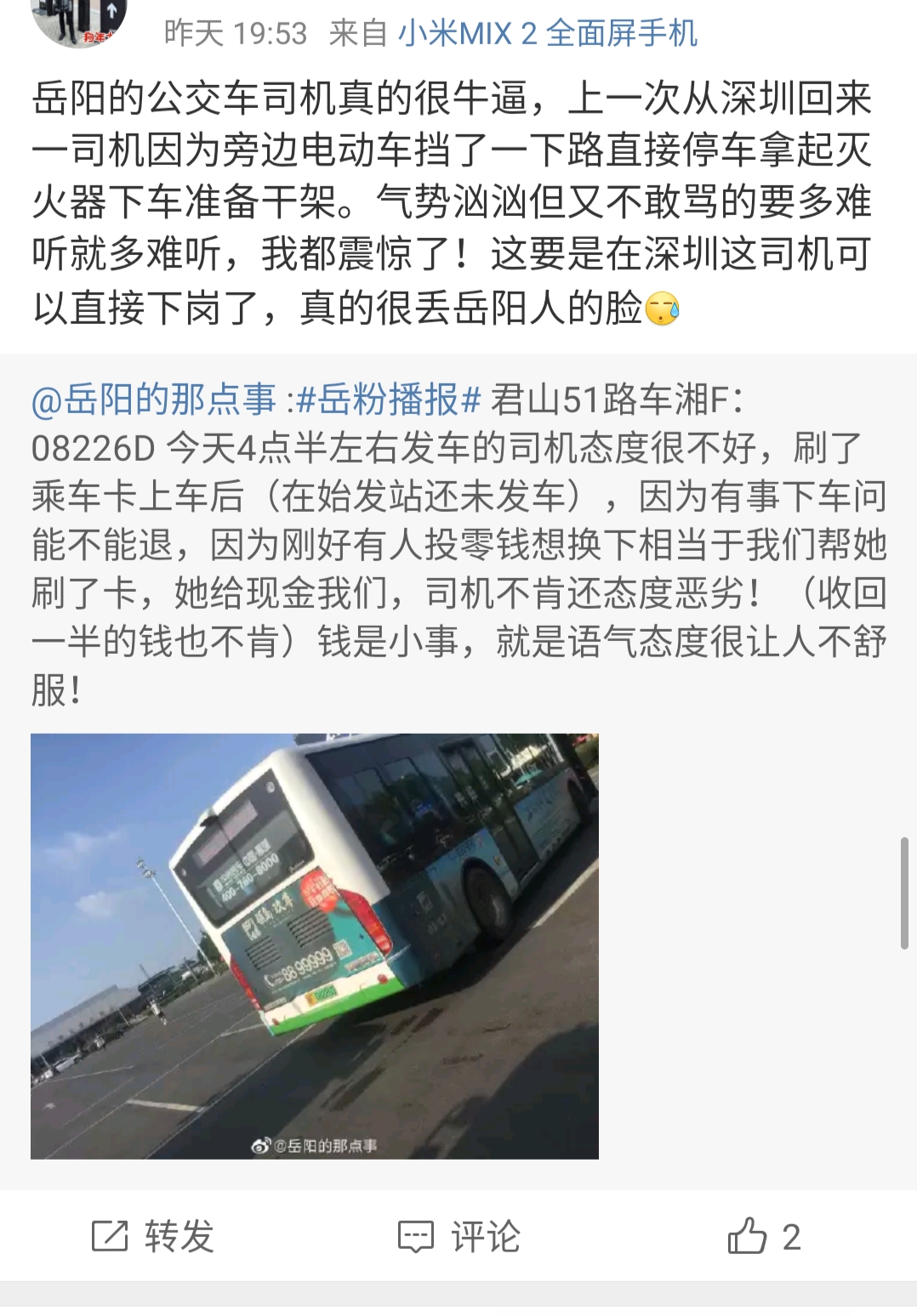 | 内容: | 这是今天在微博上看到的,说的51路司机态度不好,对于这件事我并不惊讶,因为说51路司机态度不好的挺多的。 我不坐51路,但是从微博上,新闻上,其他曝光途径我最少看到过四个51路吐糟司机的时间不是,什么不让老人上车,什么违法形式,还有今天服务态度,岳阳这么多线路虽然别的线路也有态度投诉,但也是极少。像51路这种隔断时间看见一次投诉,吐糟的51路第一没人第二,不知道君山公交公司是怎么培养司机素质以及服务态度的问题的。 是要理解的司机,但是司机也请理解乘客,司机现在受到保护不代表他们可以随意,不代表他们可以服务态度不好,肯定有乘客很难说话或者素质不高,但是不代表司机同样也素质不高,说公交也是一个城市的门面,51路还在火车站,这要是外地人怎么看,何况别人还在微博上说,这样曝光出来说的是岳阳,不是单单一个公交线路,不是一个司机,希望你们那能提高一下51路司机们的服务态度问题,撑好这个门面。 |