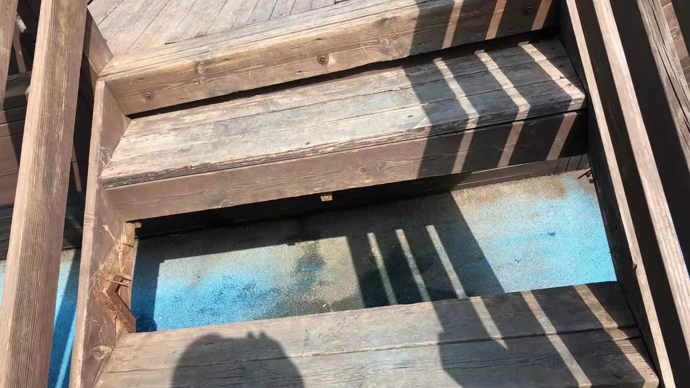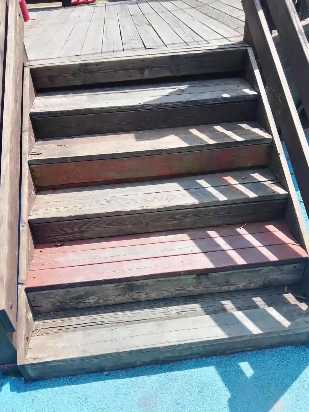 您好!在南津港大堤旁边靠近南湖一侧,有一艘海盗船,有一个木楼梯,年久失修,已经坏了一个木板台阶,其他台阶也不安全了,很多小朋友在这里玩,请相关部门尽快修好,消除安全隐患。谢谢!