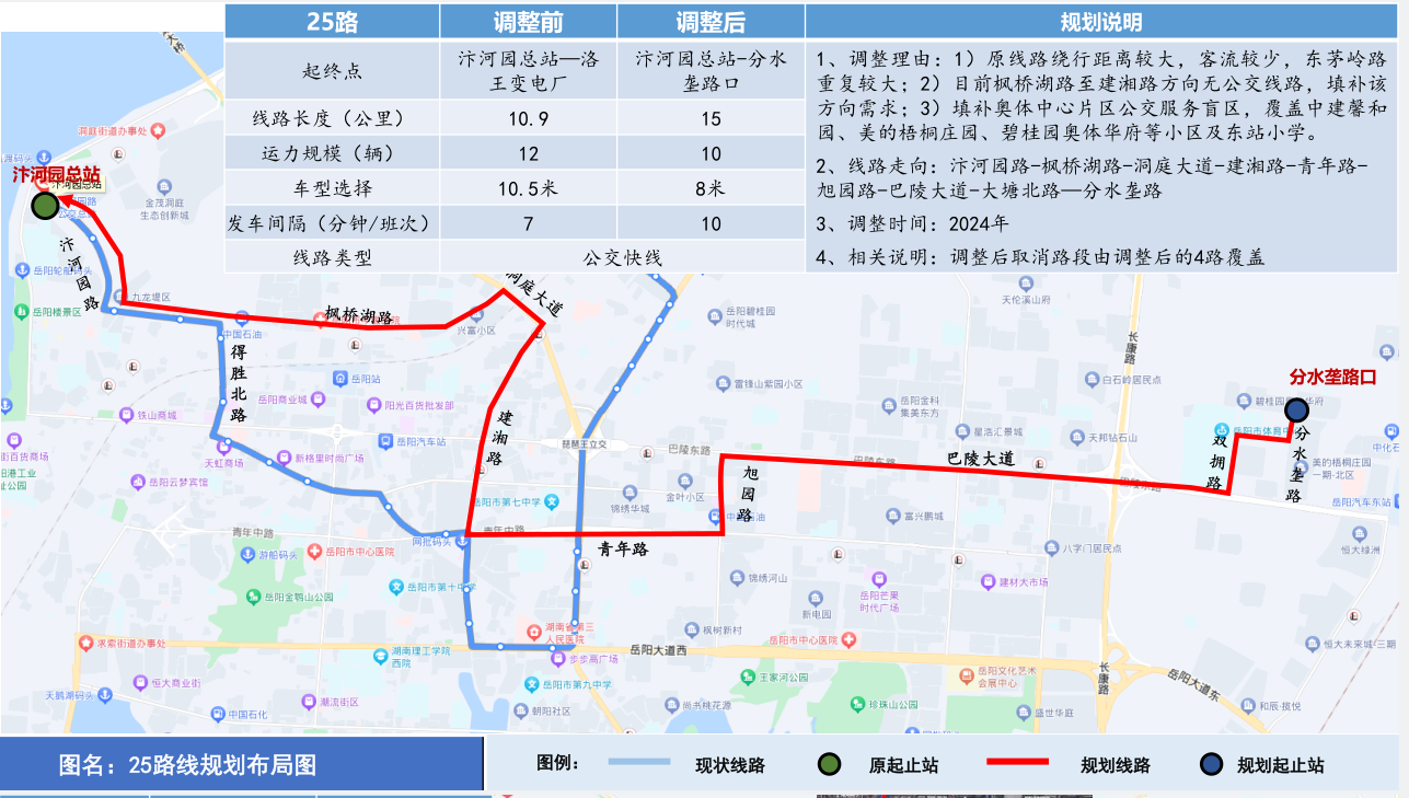您所咨询的问题已收悉,感谢您对岳阳公交的理解与支持。25路拟规划调整终点站至分水垄路,方便恒大华府、美的梧桐庄园、中建馨和家园及东站小学沿线市民学生出行,目前规划调整方案正在市交通运输局官网进行意见建议征求,待方案意见建议征求完成向社会公告最终方案后,我集团公司根据道路公共基础设施条件逐步组织实施。