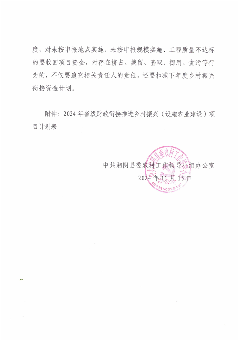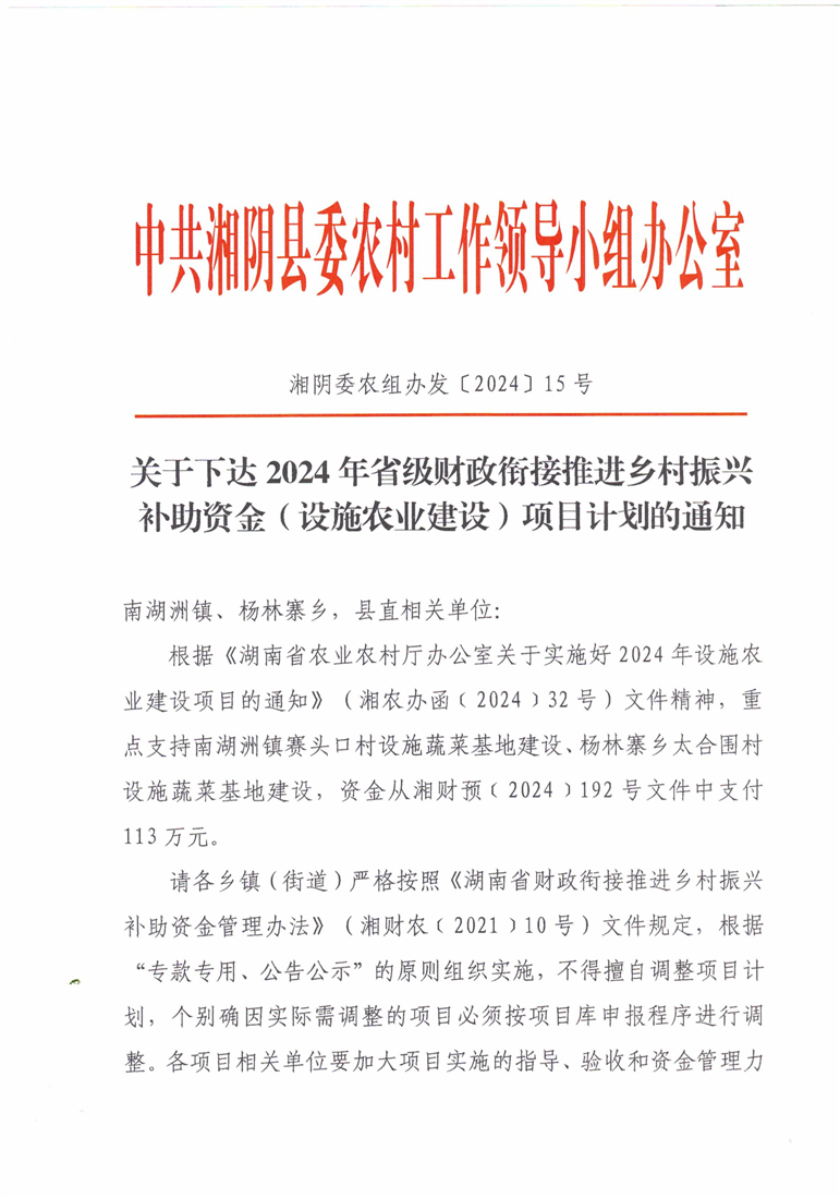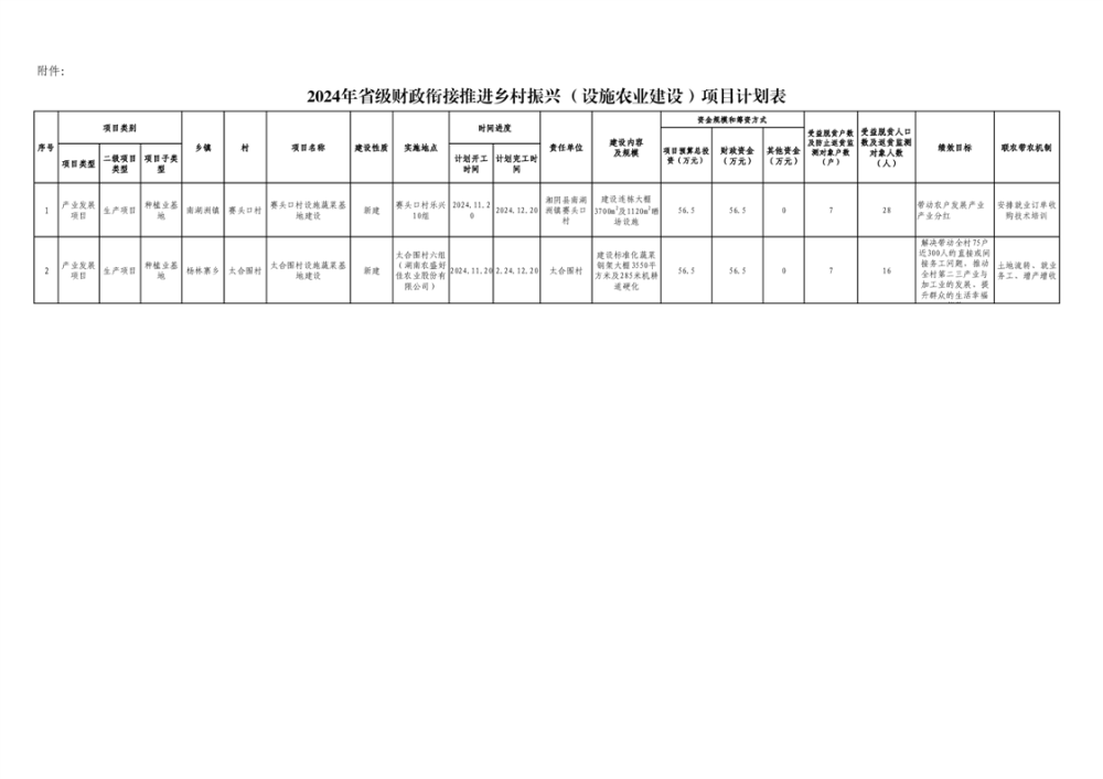关于下达2024年省级财政衔接推进乡村振兴补助资金(设施农业建设)项目计划的通知