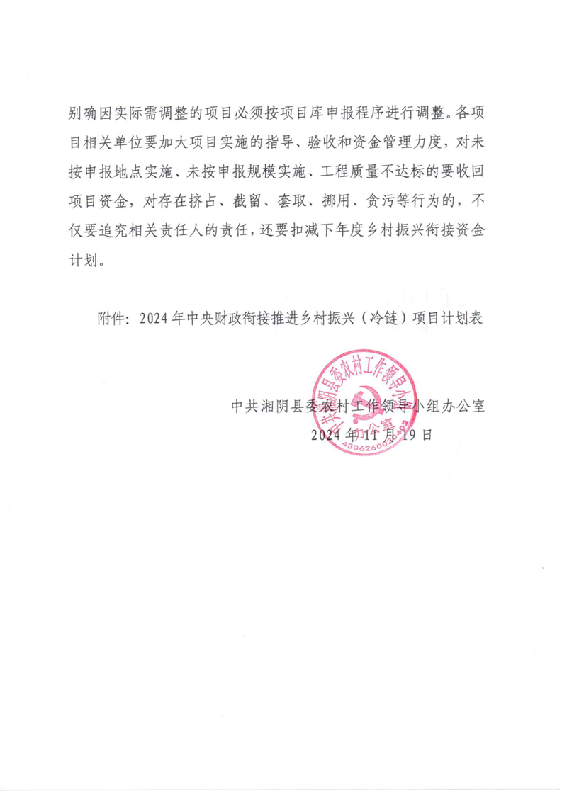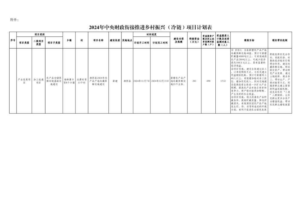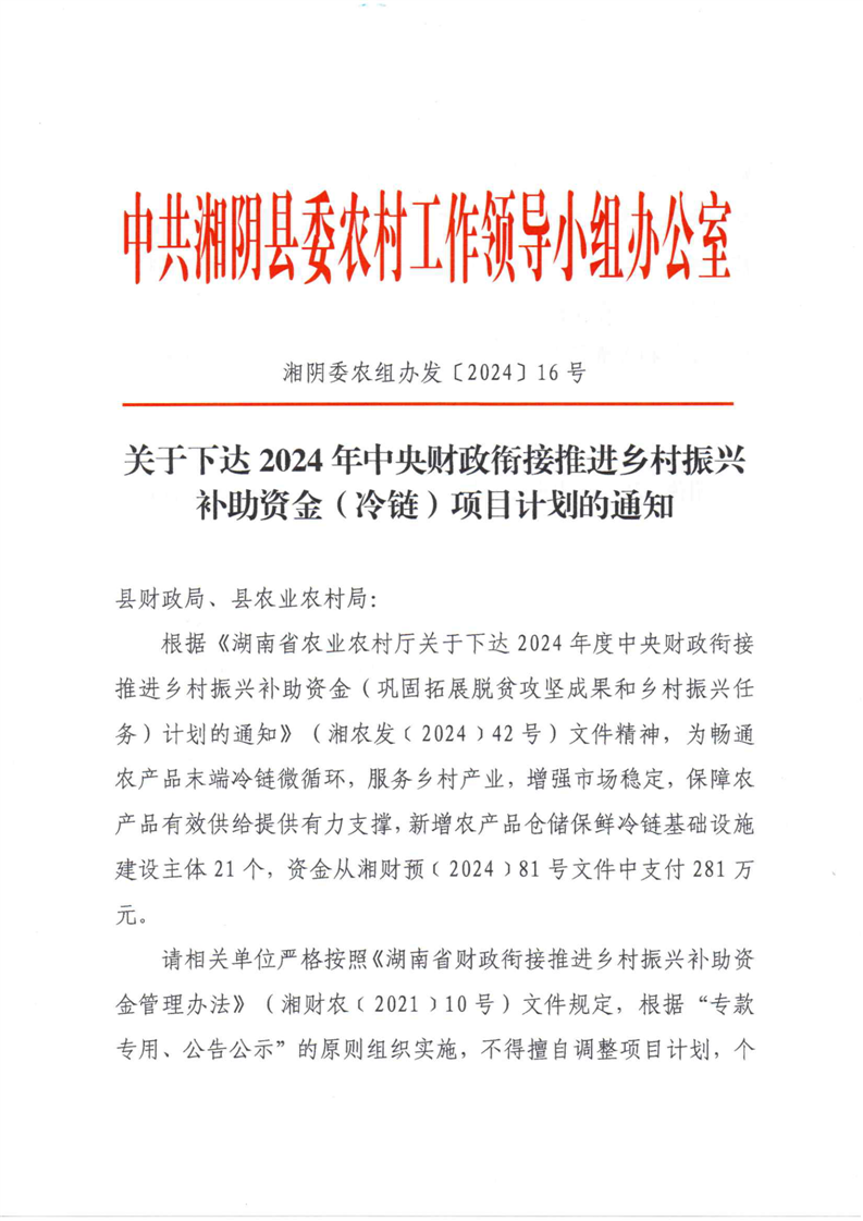 关于下达2024年中央财政衔接推进乡村振兴补助资金(冷链)项目计划的通知