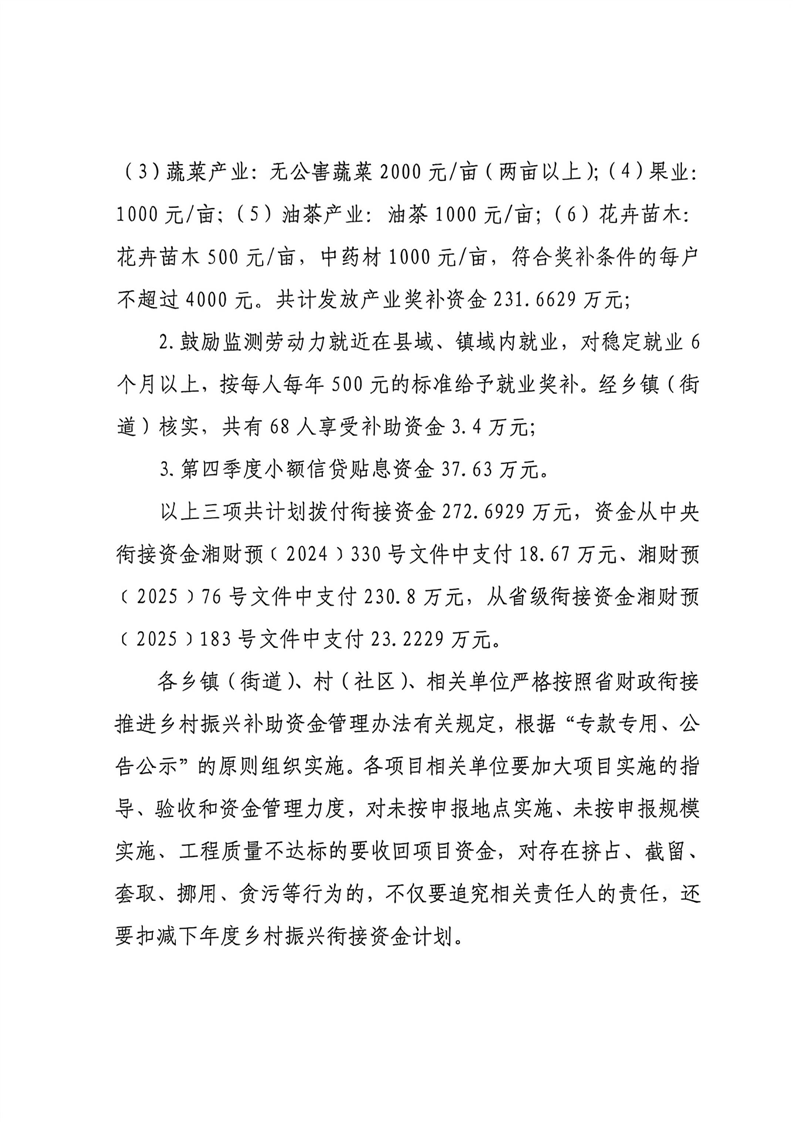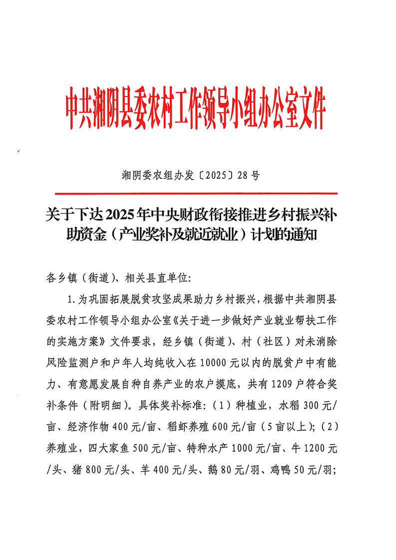 关于下达2025年中央财政衔接推进乡村振兴补助资金(产业奖补及就近就业)计划的通知