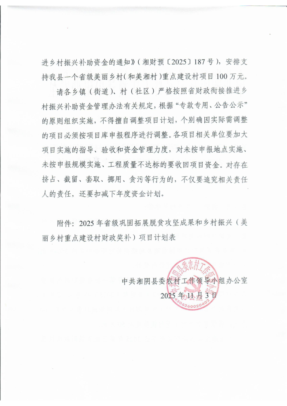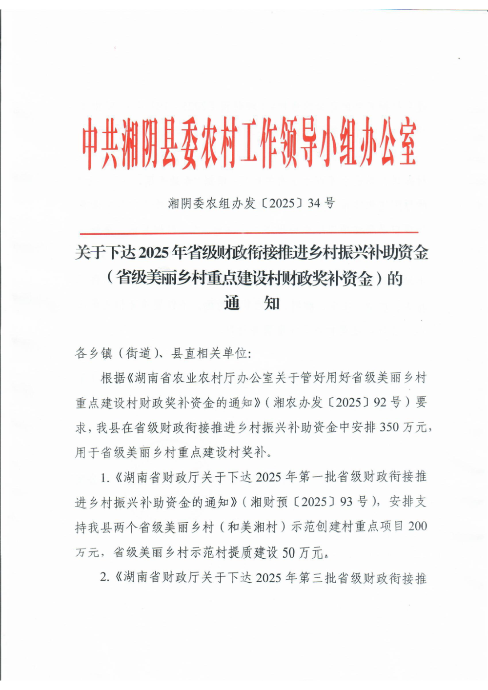 关于下达2025年省级财政衔接推进乡村振兴补助资金(省级美丽乡村重点建设村财政奖补资金)的通知