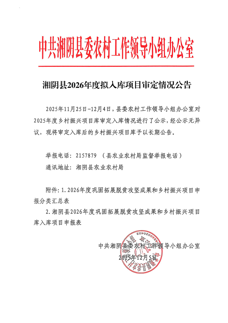 湘阴县2026年度拟入库项目审定情况公告