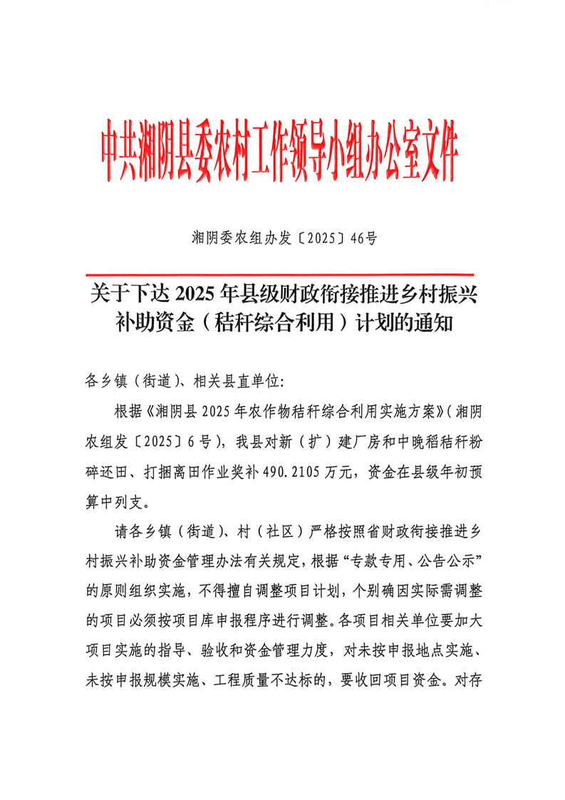 关于下达2025年县级财政衔接推进乡村振兴补助资金(秸秆综合利用)计划的通知