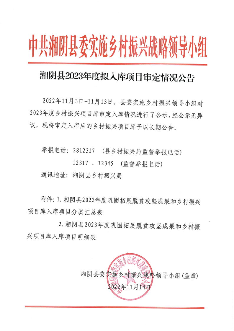 湘阴县2023年度拟入库项目审定情况公告