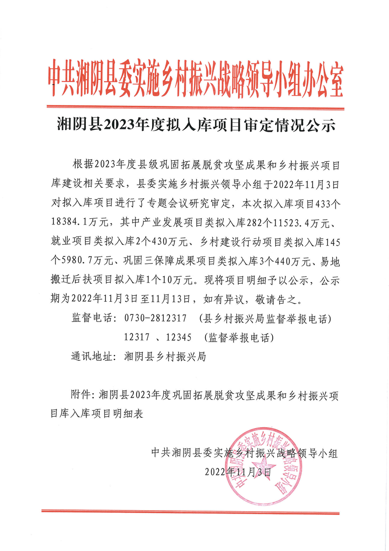 湘阴县2023年度拟入库项目审定情况公示