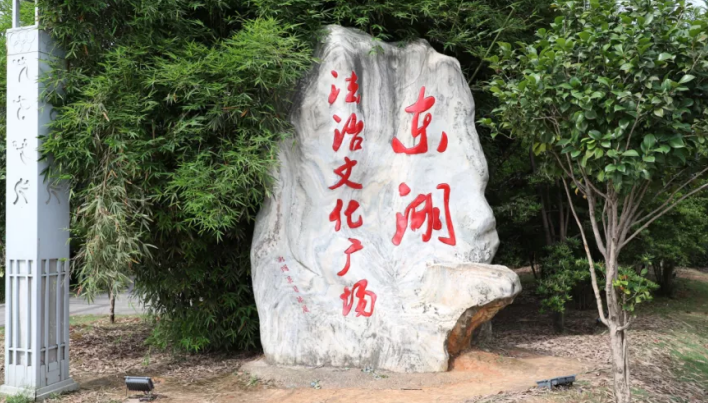 这里不仅位临清澈的东湖,风清气爽,环境优雅,而且更吸睛的是错落有致、形状各异、生动有趣的法治宣传标语海报等。法治宣传长廊、法律大讲堂、各种造型的法治宣传栏、圆环法治宣传灯箱,听海亭里抬头可见的法治海报,让人感受到设计者的巧思。