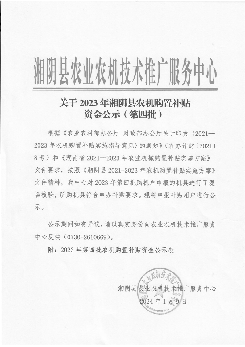 关于2023年湘阴县农机购置补贴资金的公示(第四批)