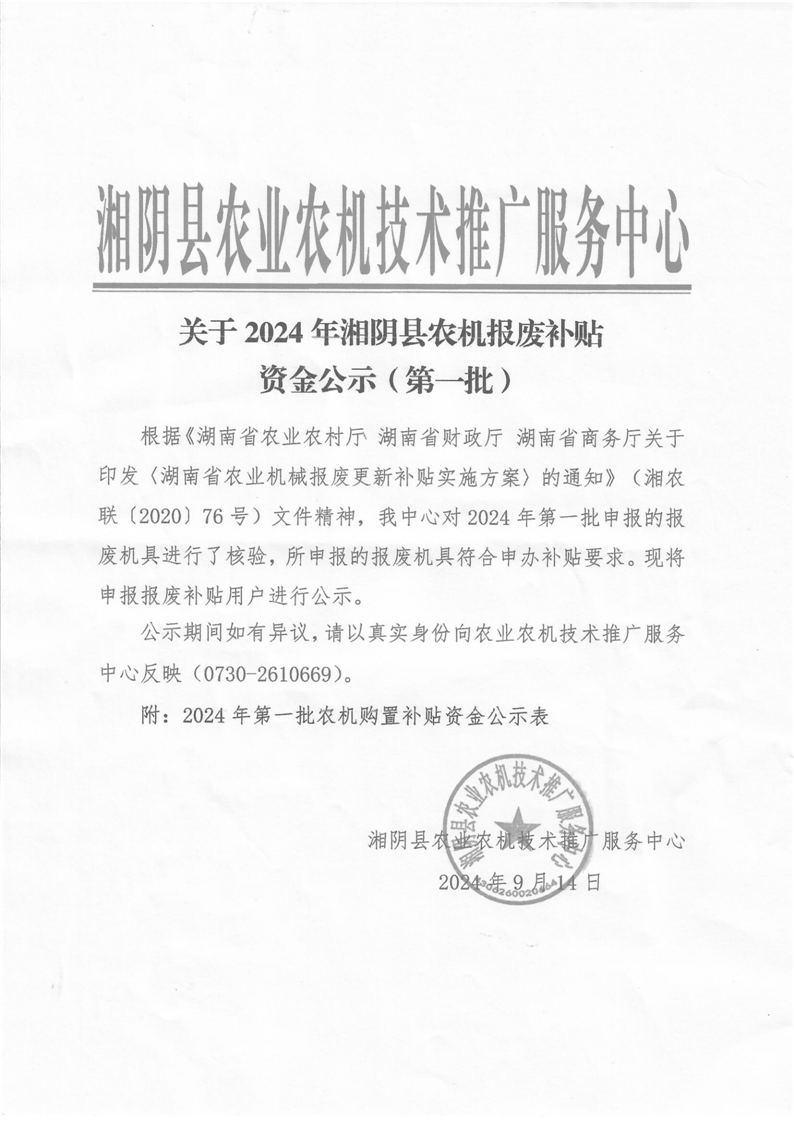 关于2024年湘阴县农机报废补贴资金公示(第一批)