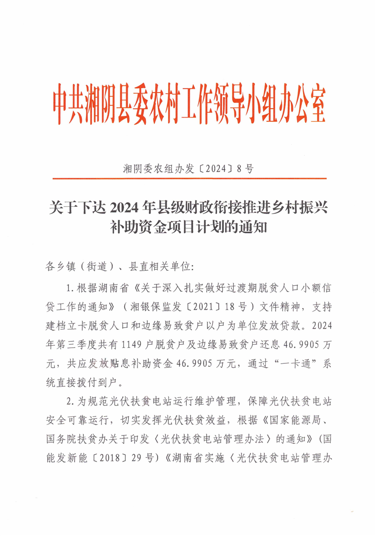 关于下达2024年县级财政衔接推进乡村振兴补助资金项目计划的通知