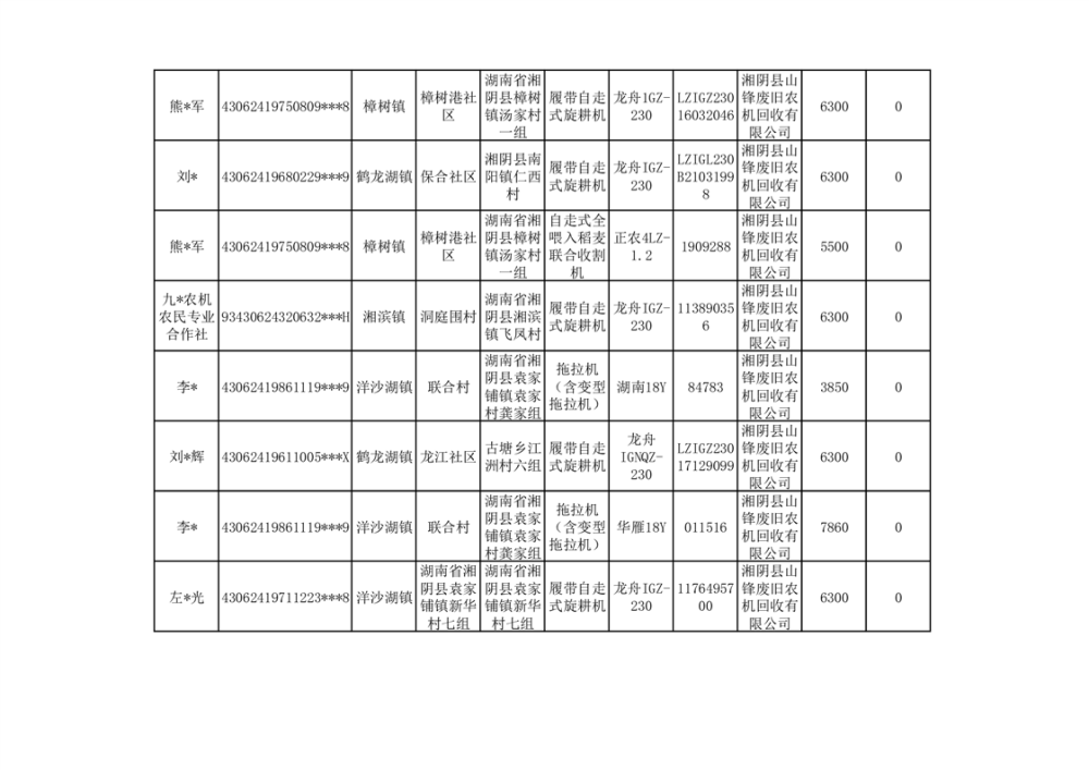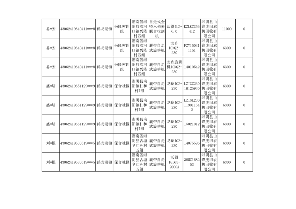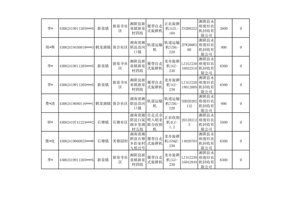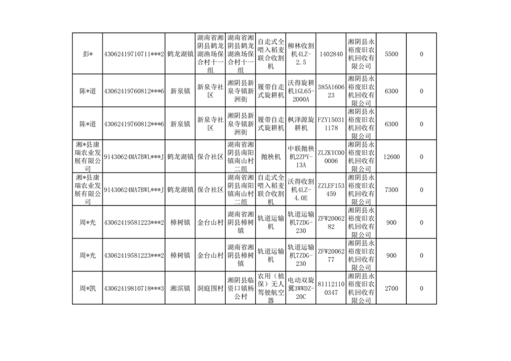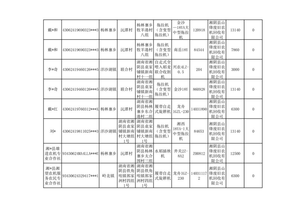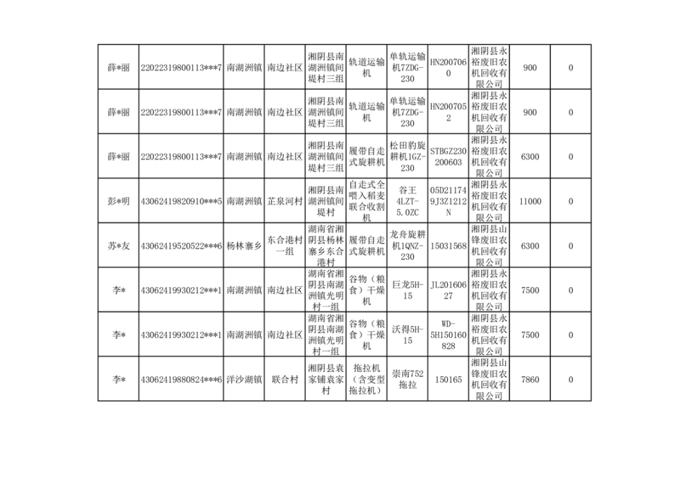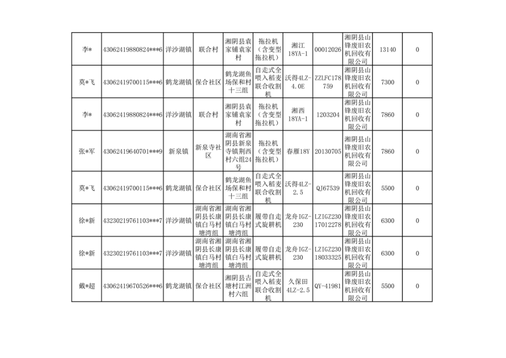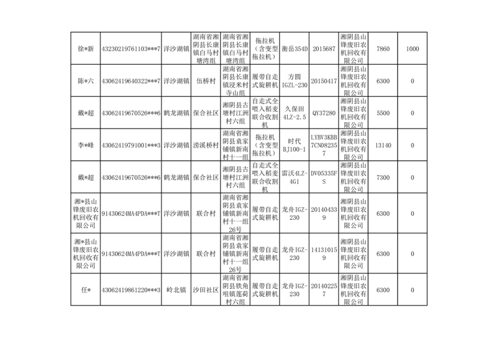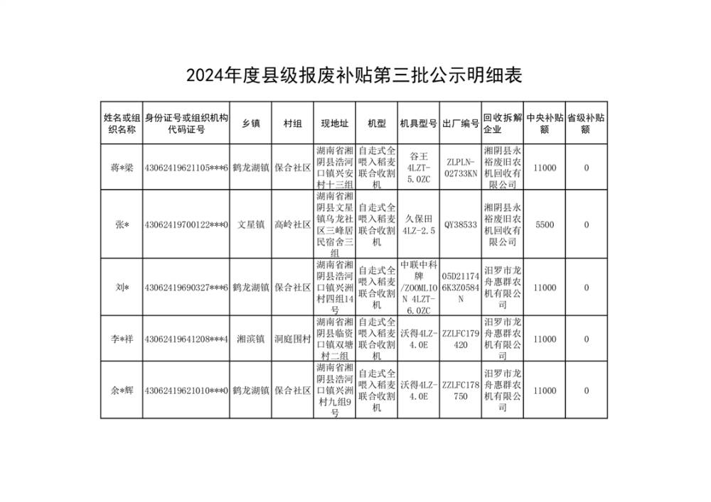 2024年湘阴县农机报废更新补贴资金公示(第三批)