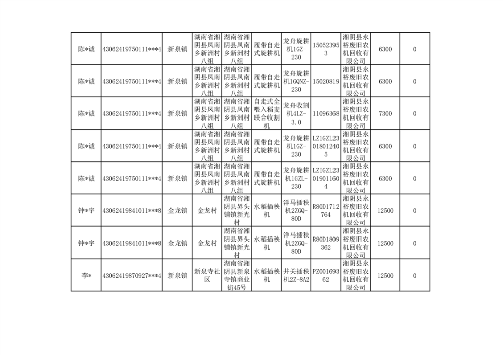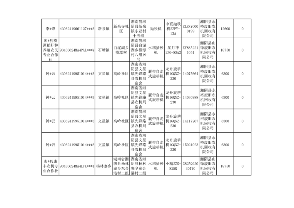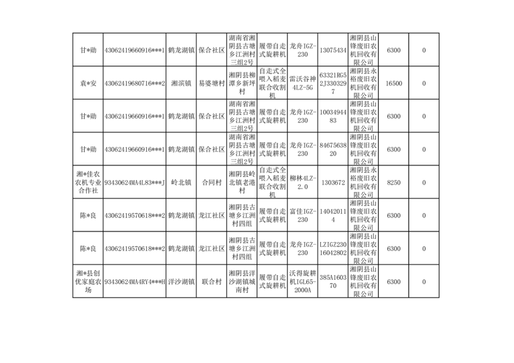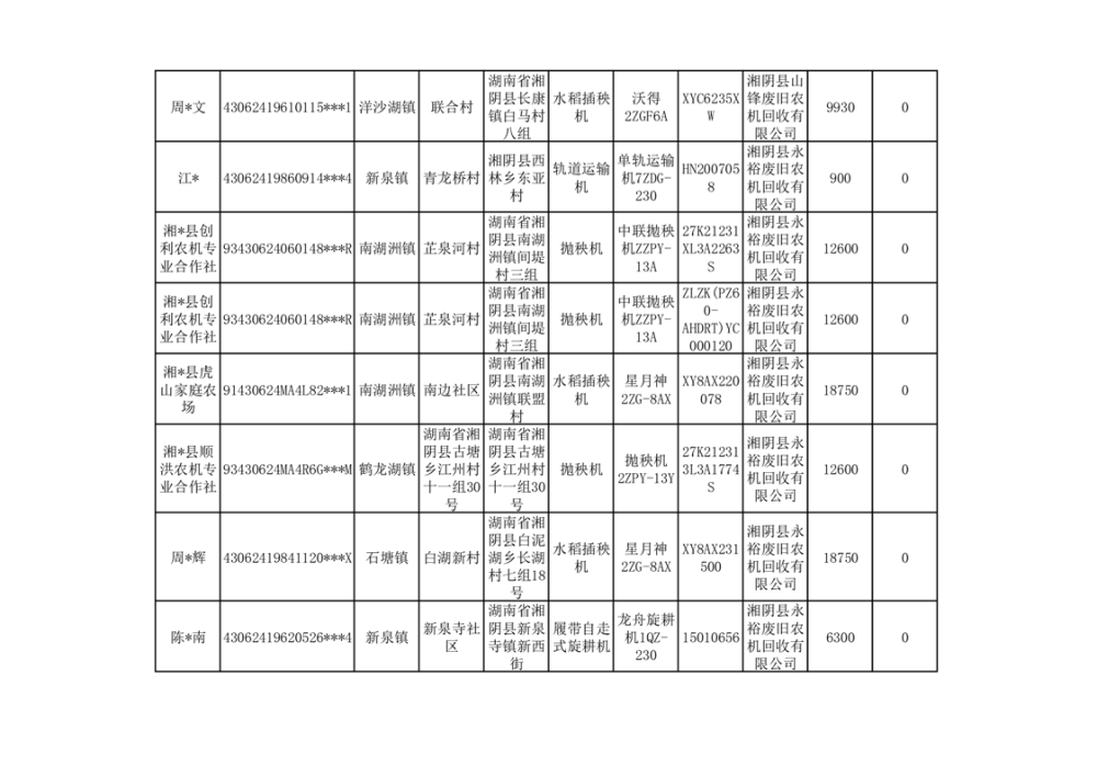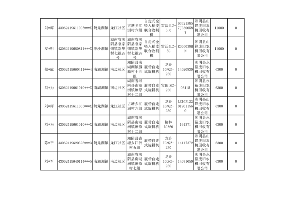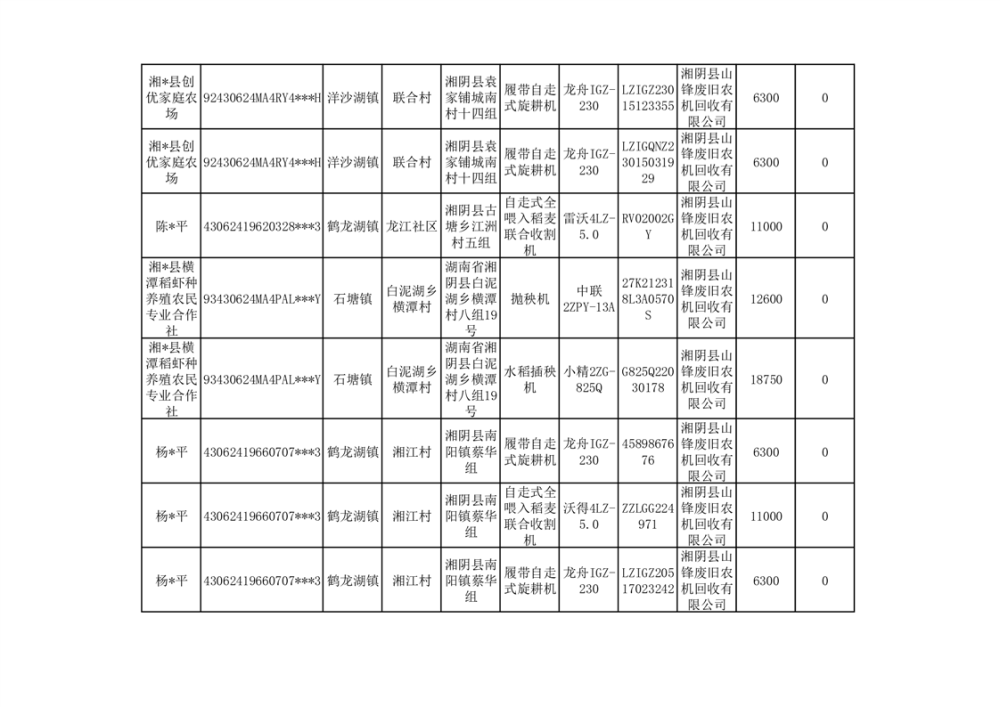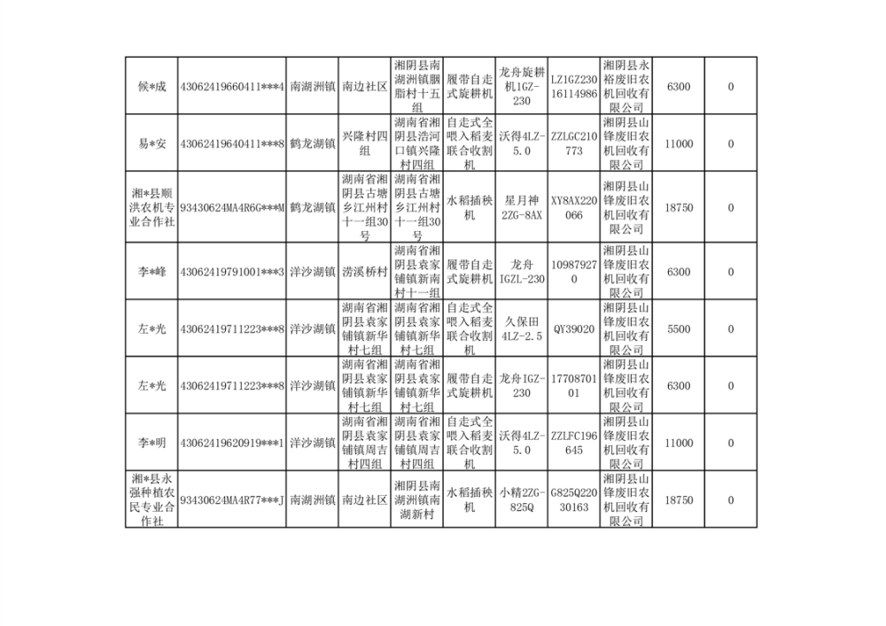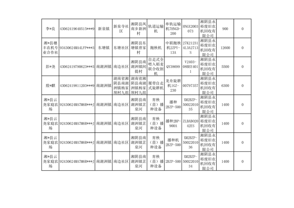 2024年湘阴县农机报废更新补贴资金公示(第三批)