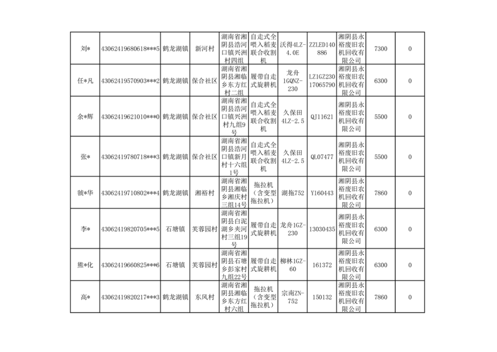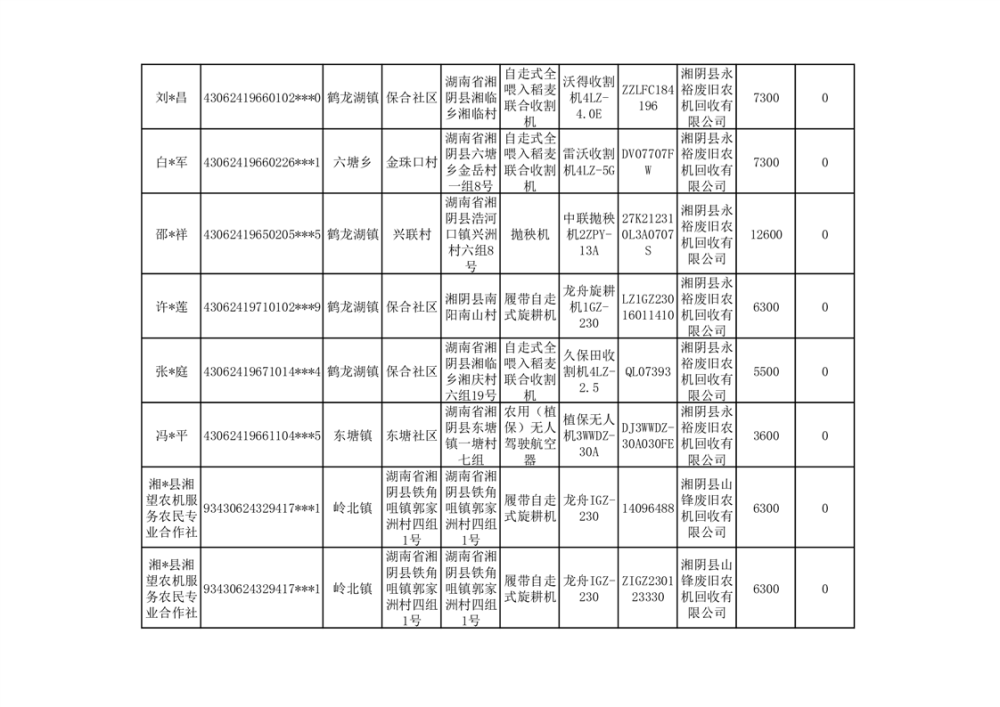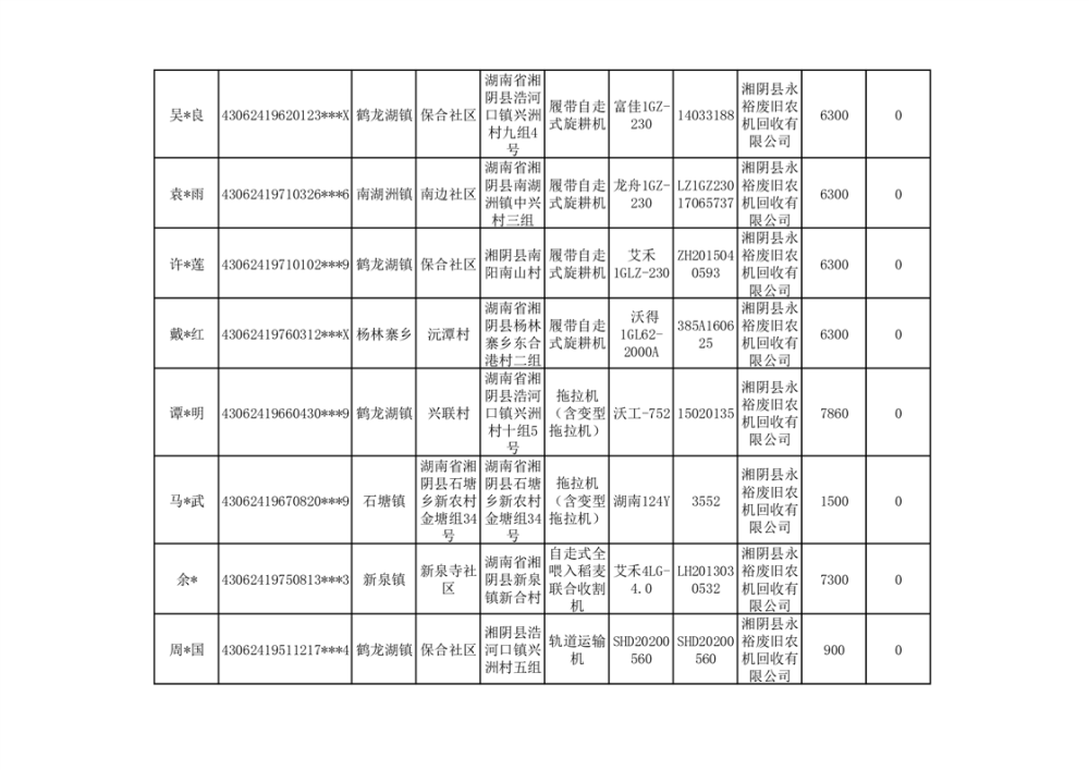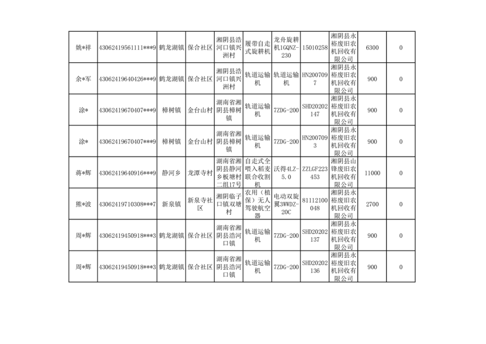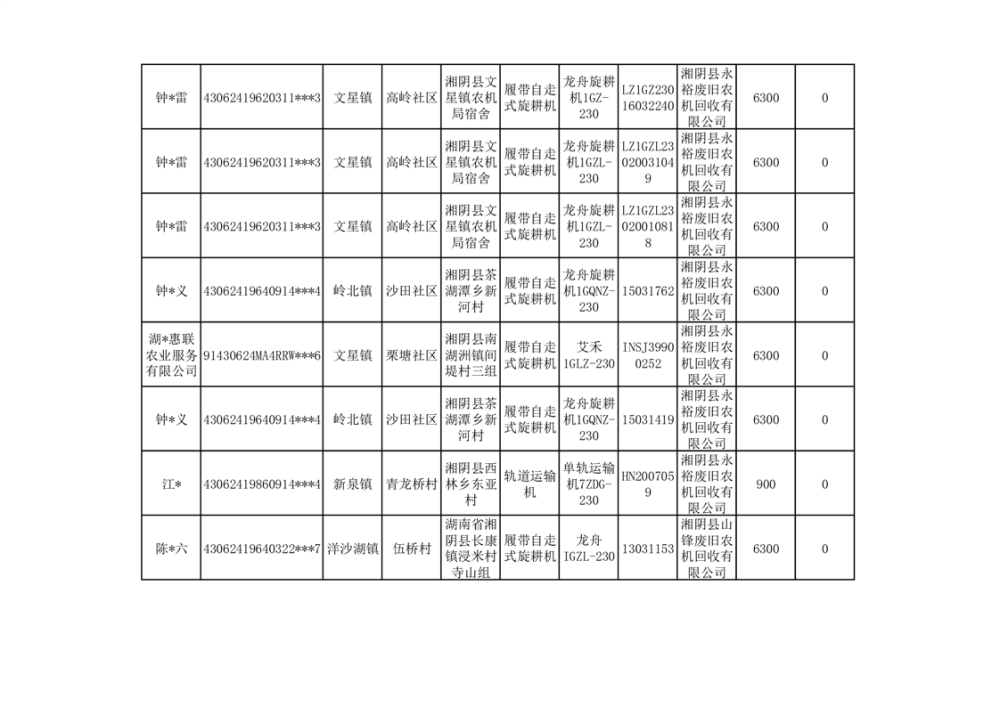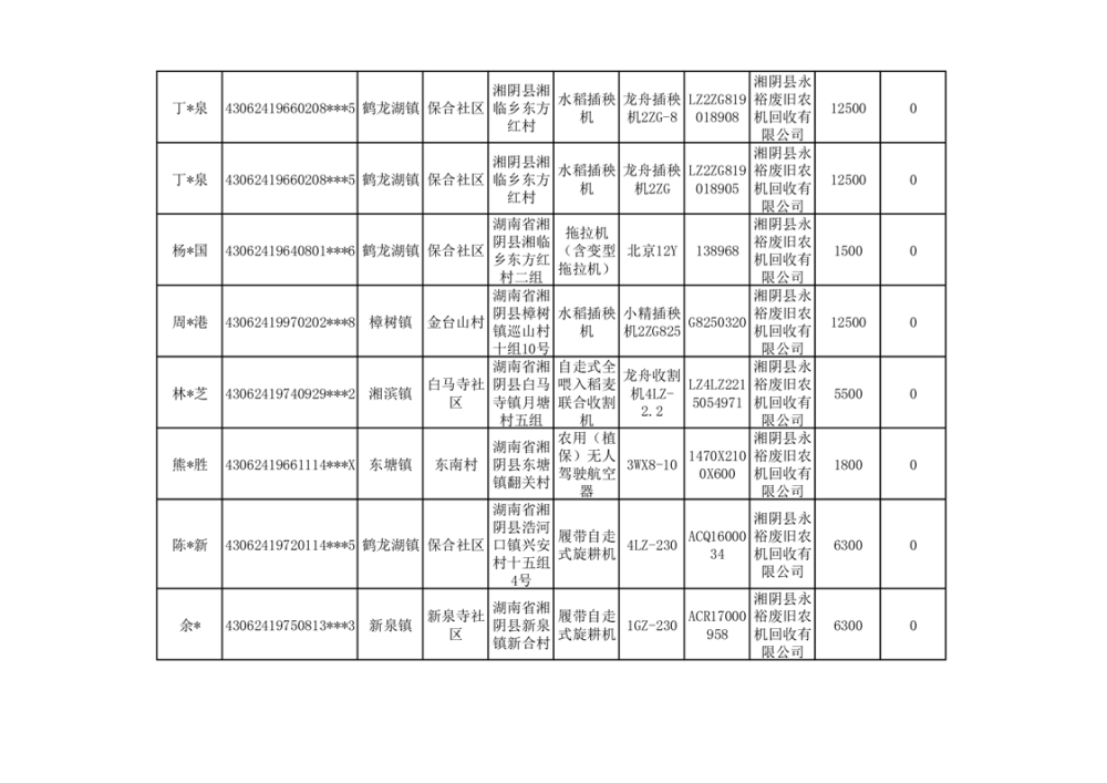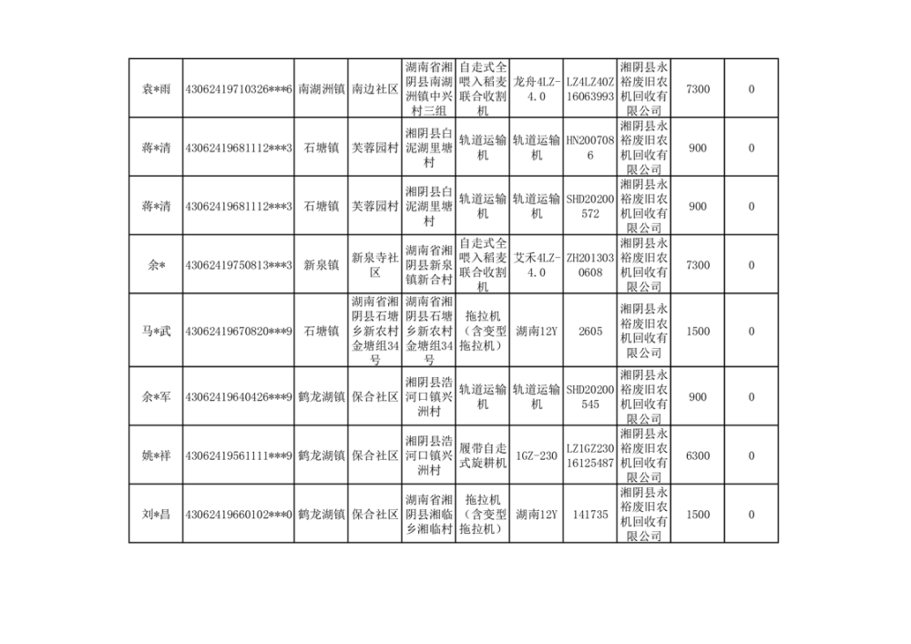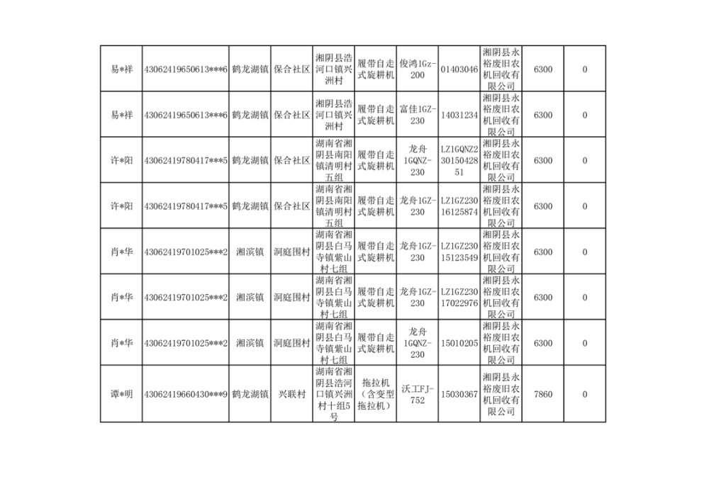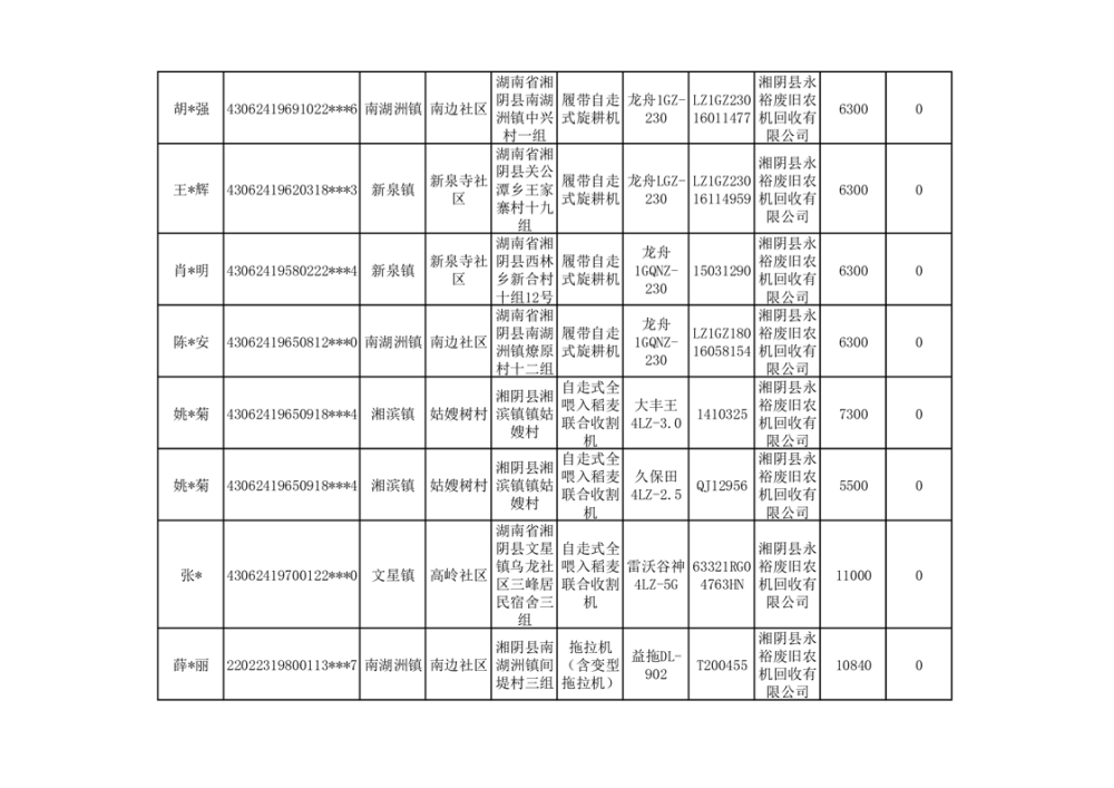 2024年湘阴县农机报废更新补贴资金公示(第三批)