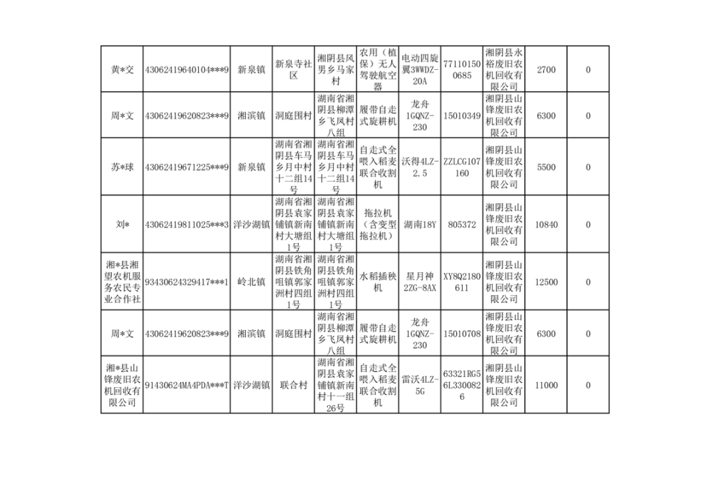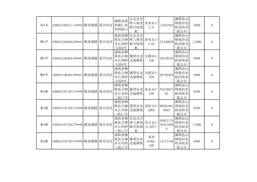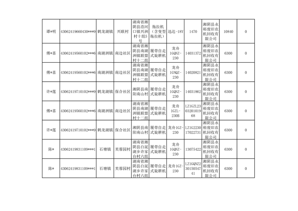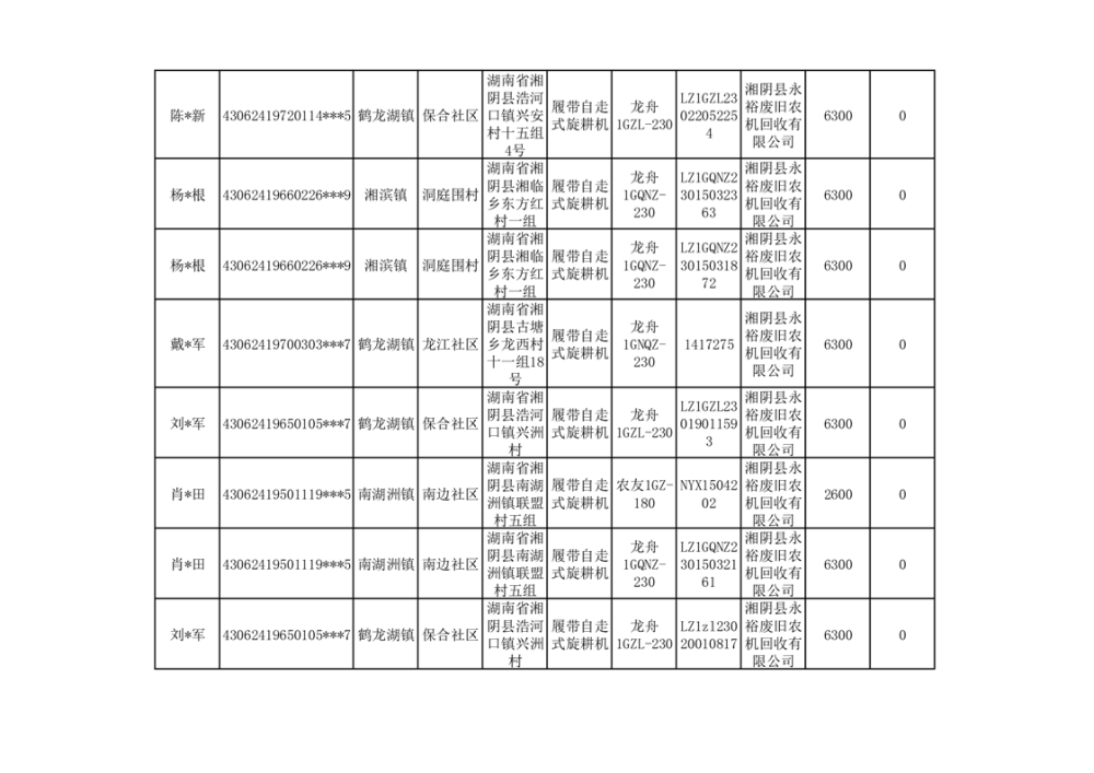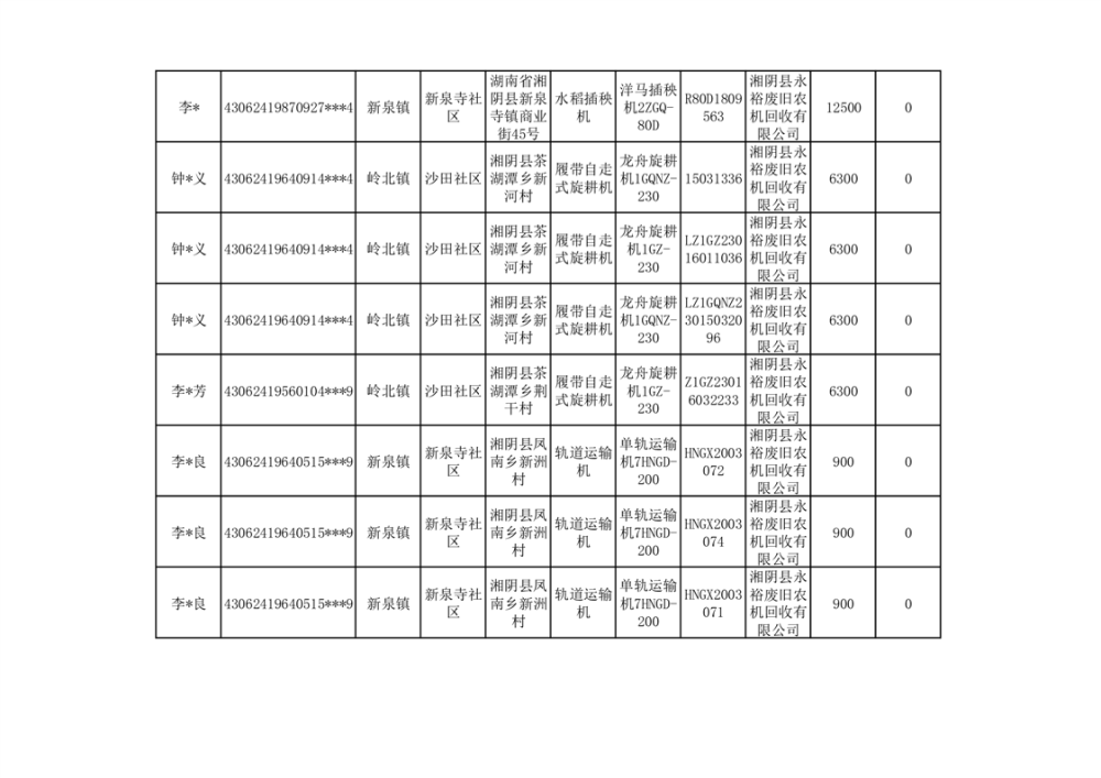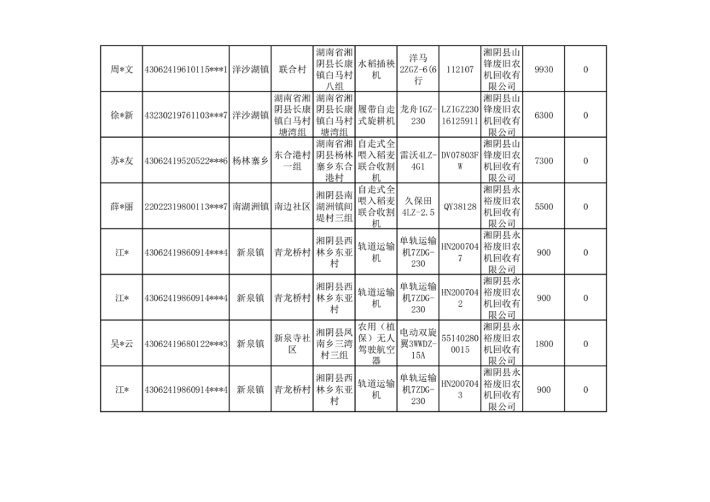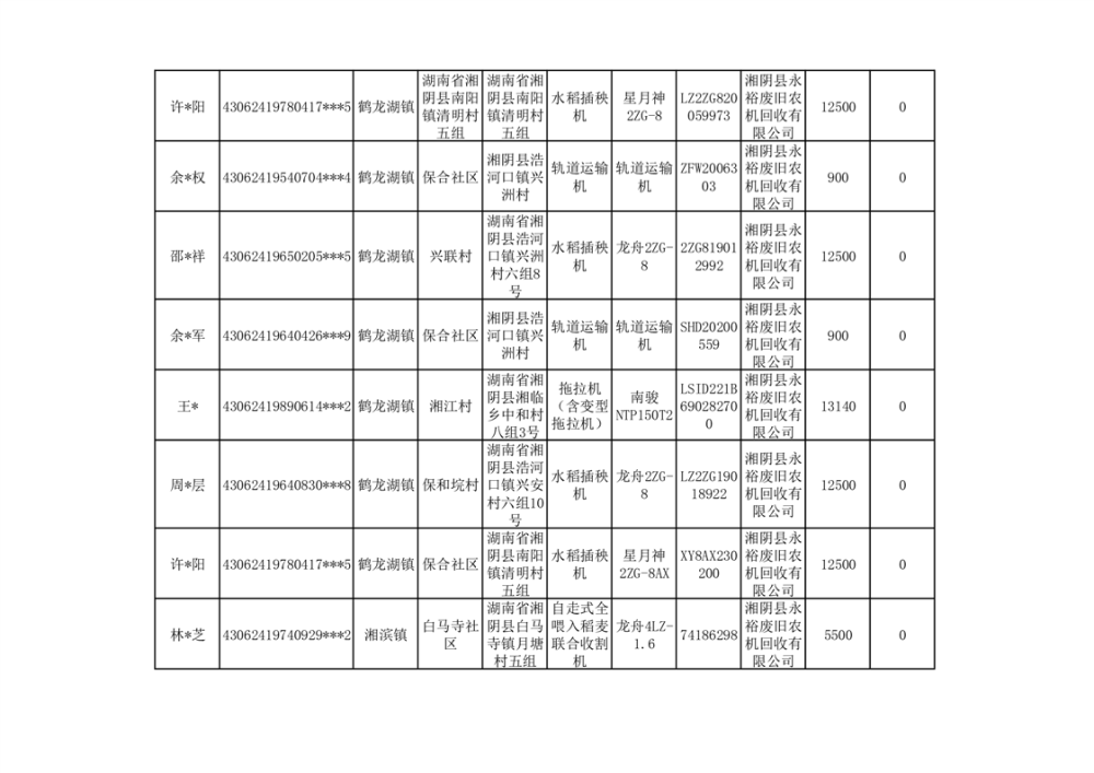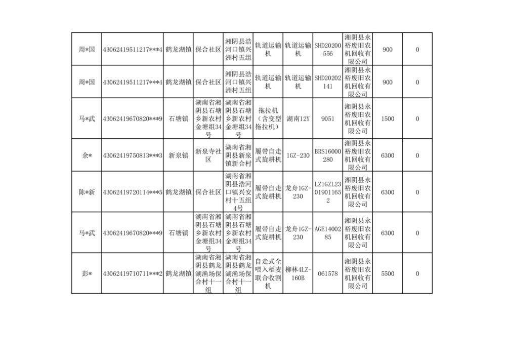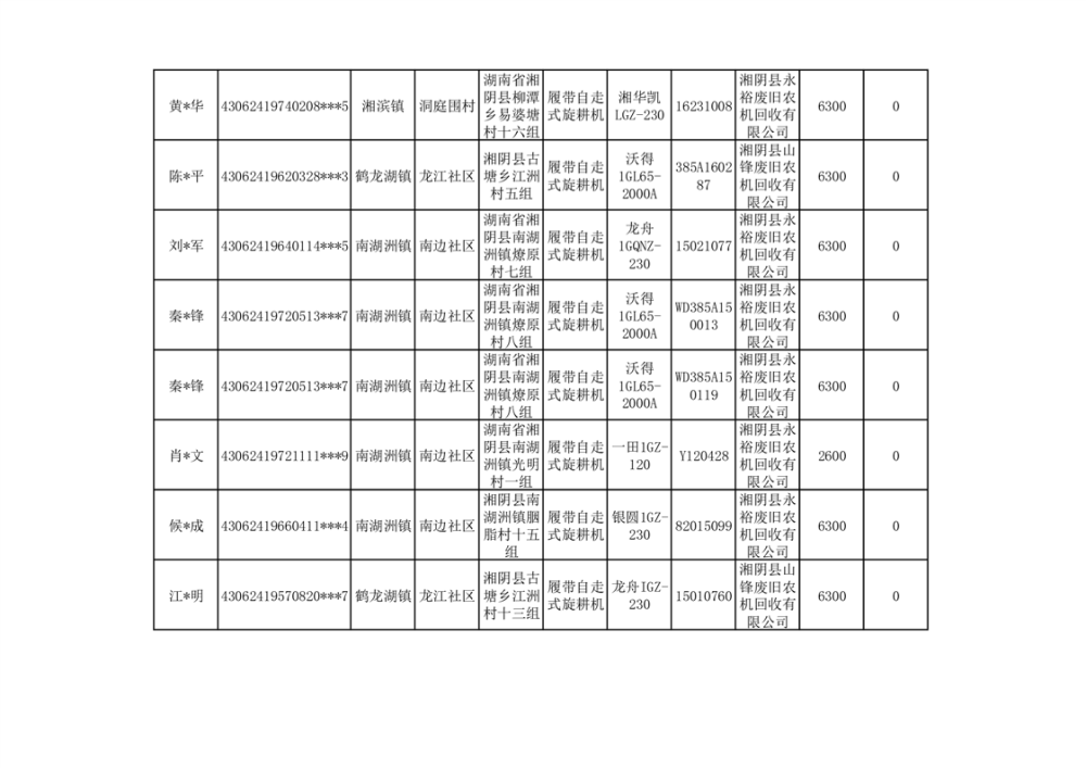 2024年湘阴县农机报废更新补贴资金公示(第三批)