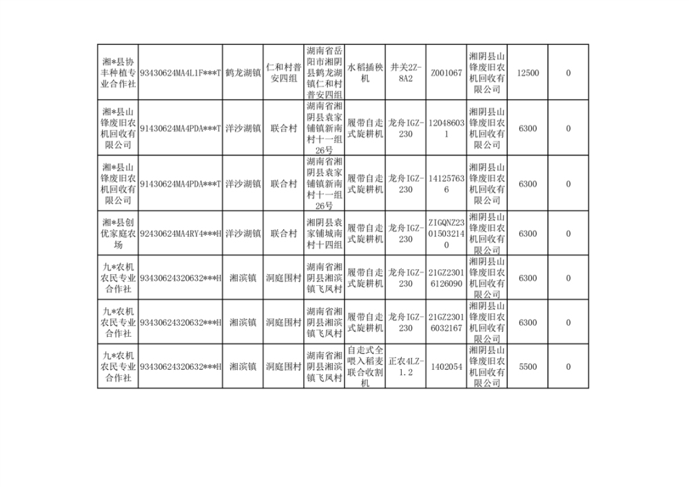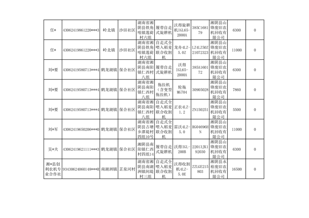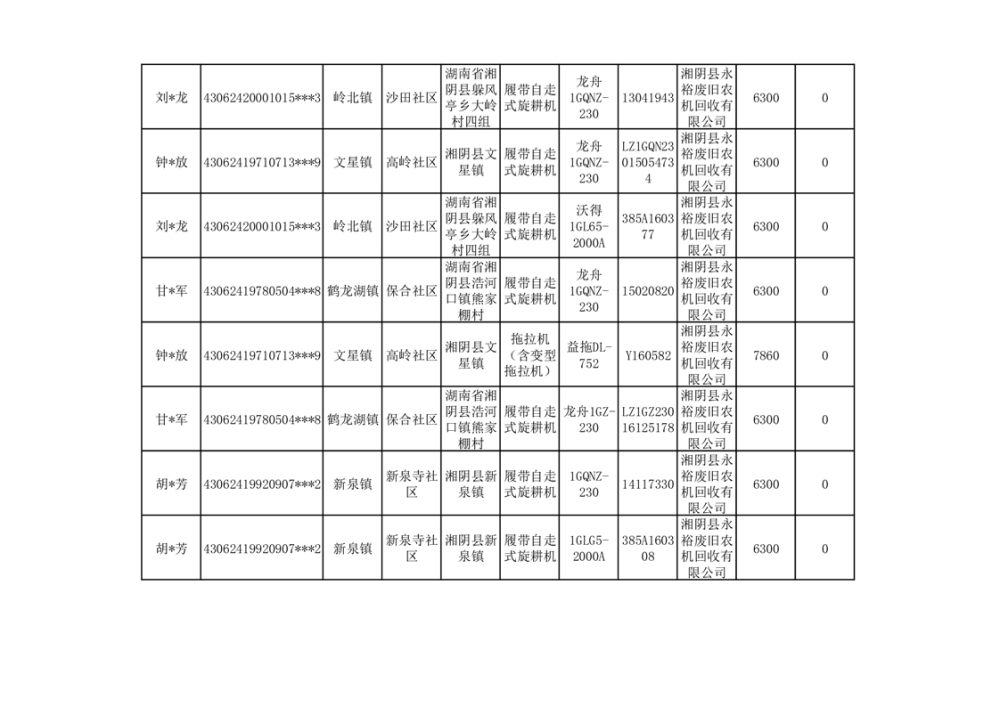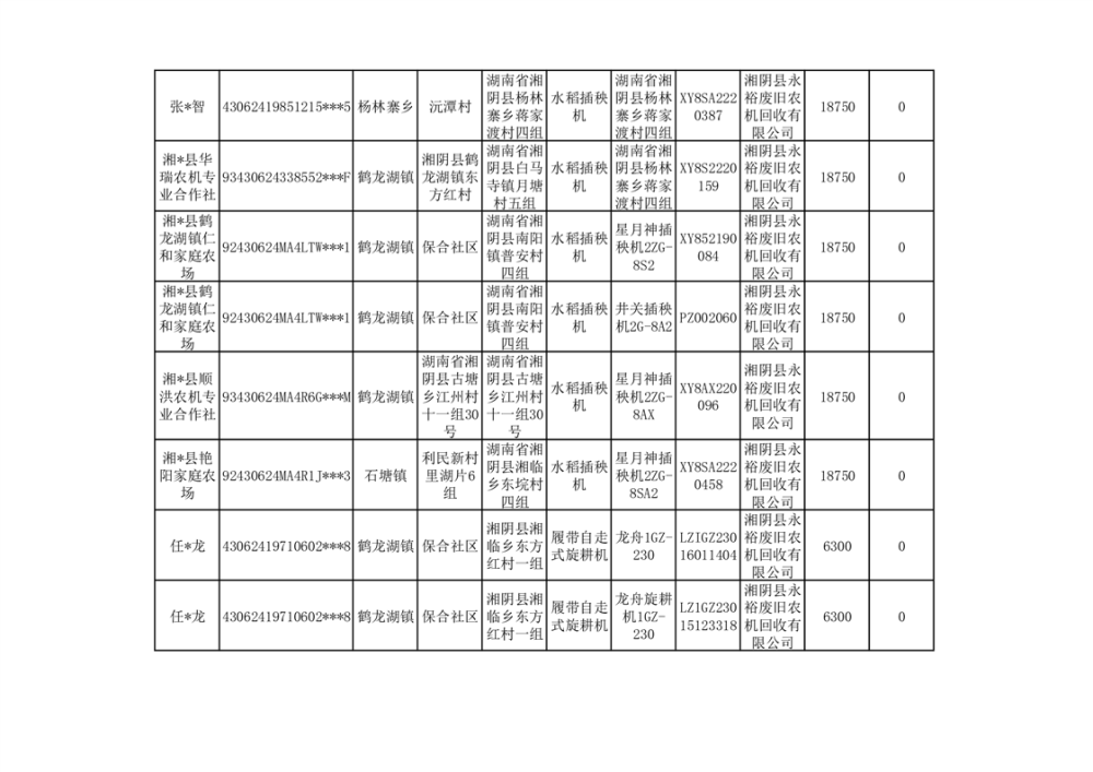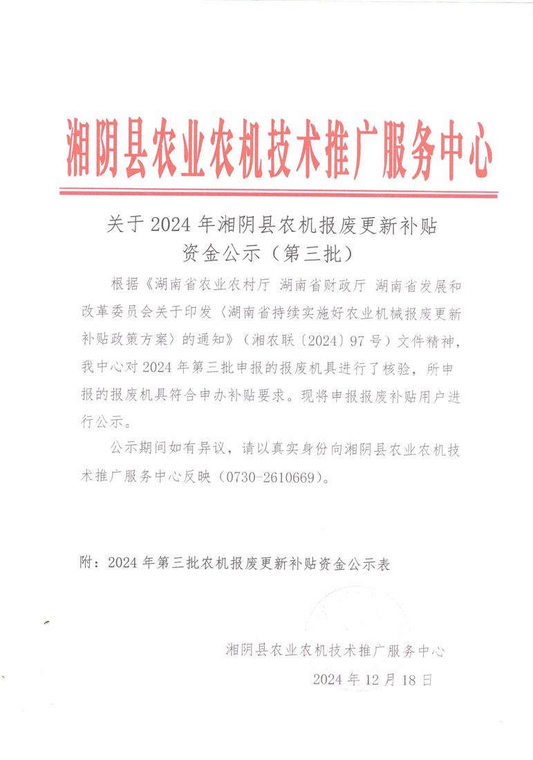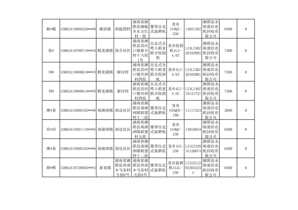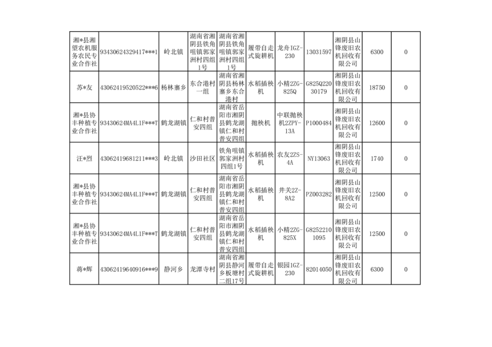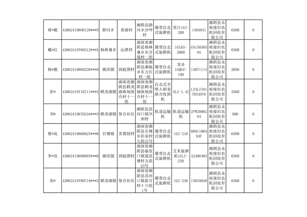 2024年湘阴县农机报废更新补贴资金公示(第三批)