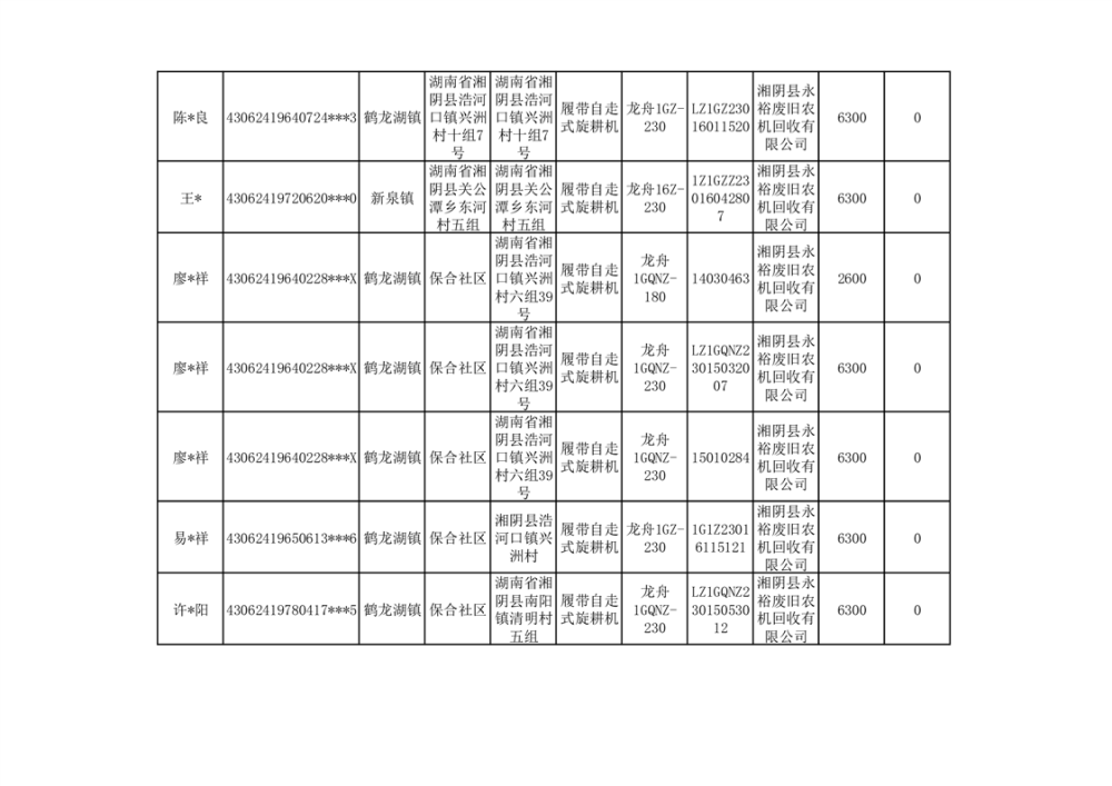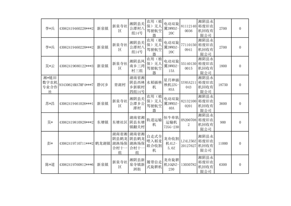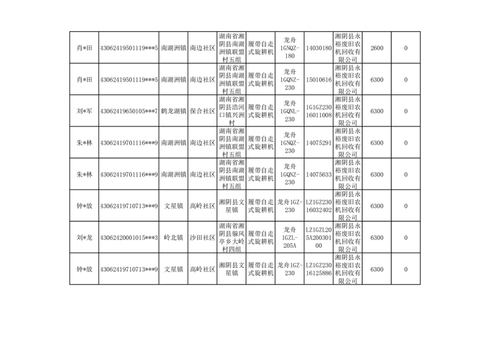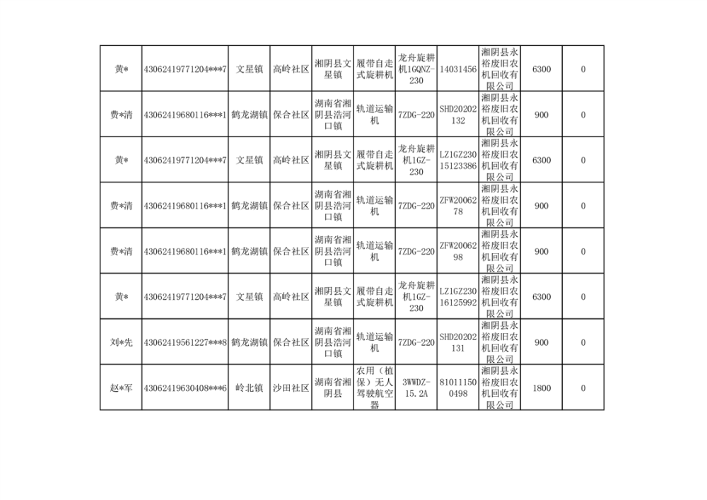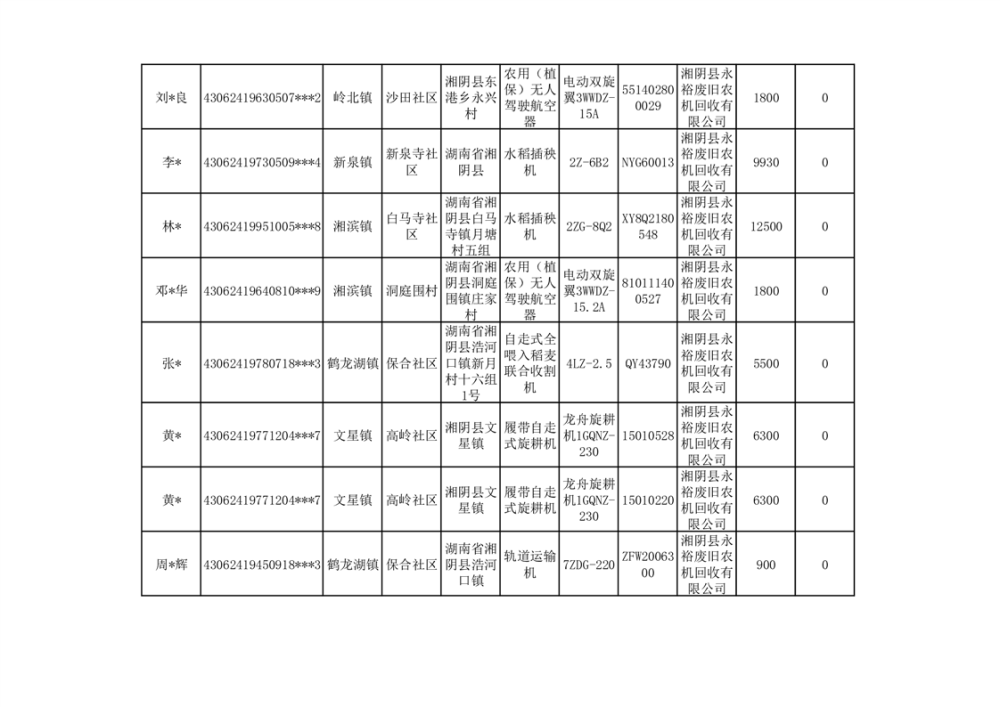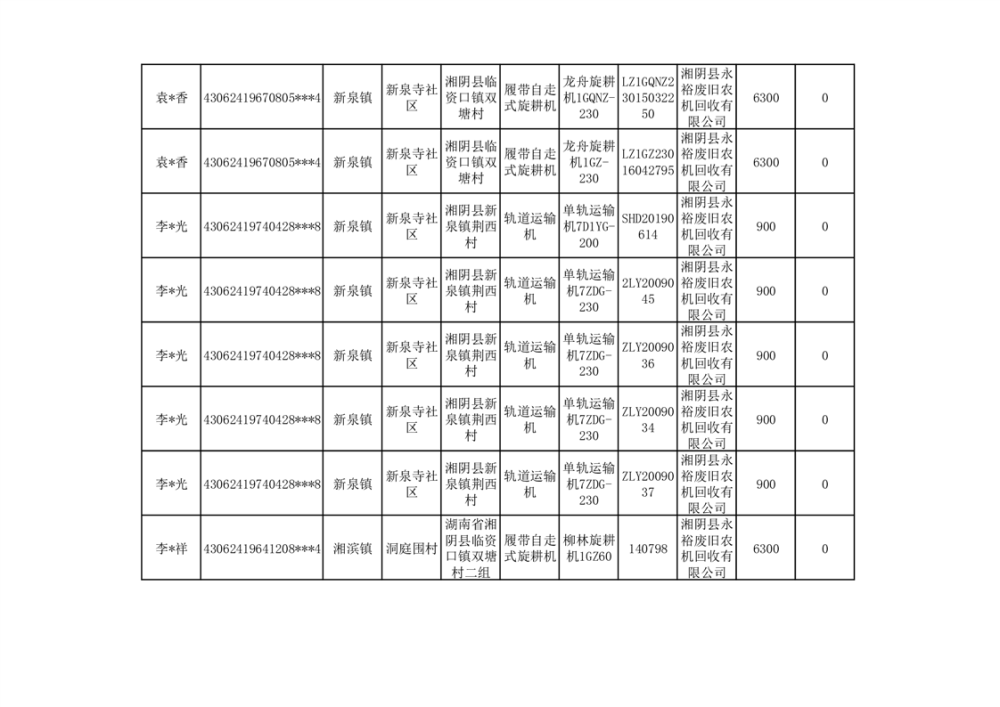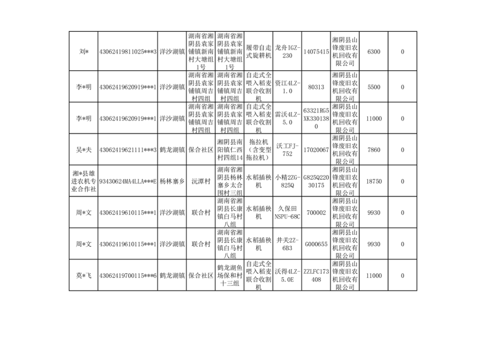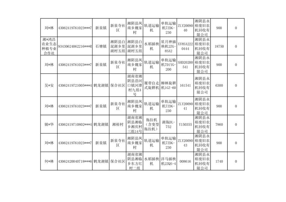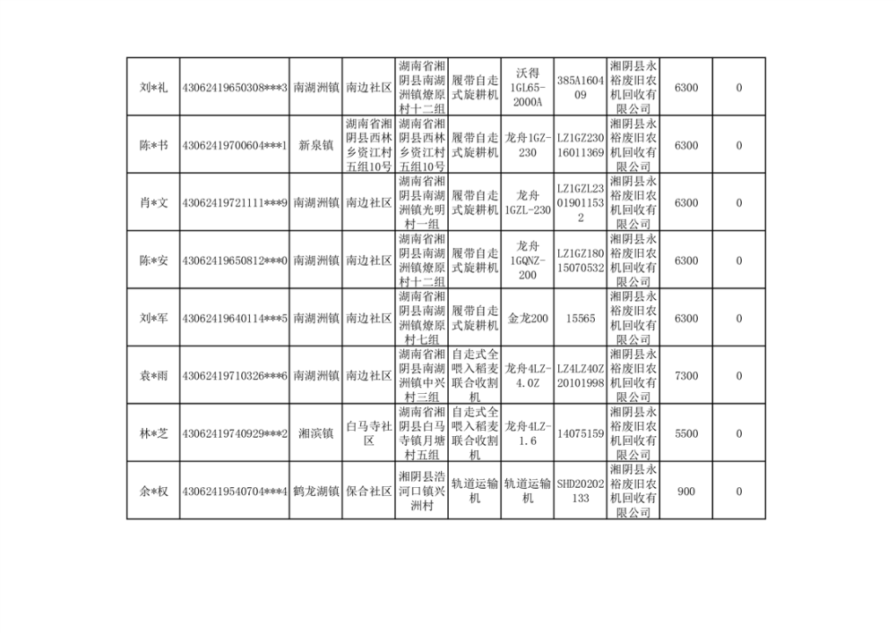 2024年湘阴县农机报废更新补贴资金公示(第三批)