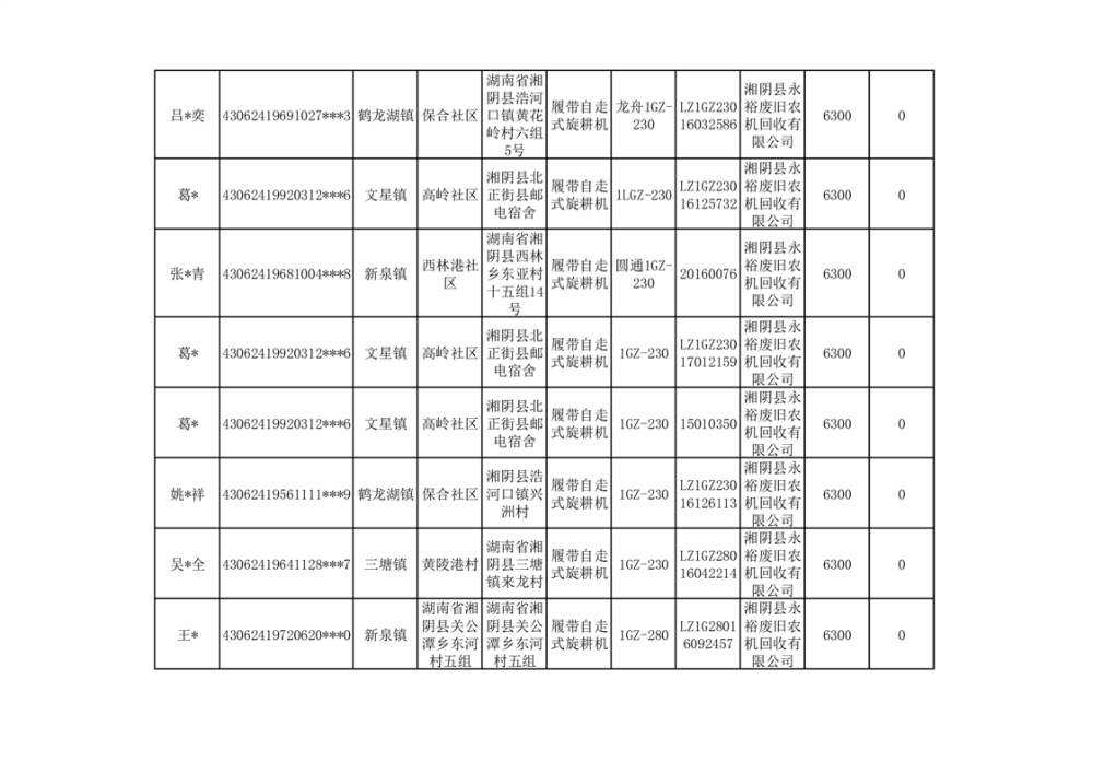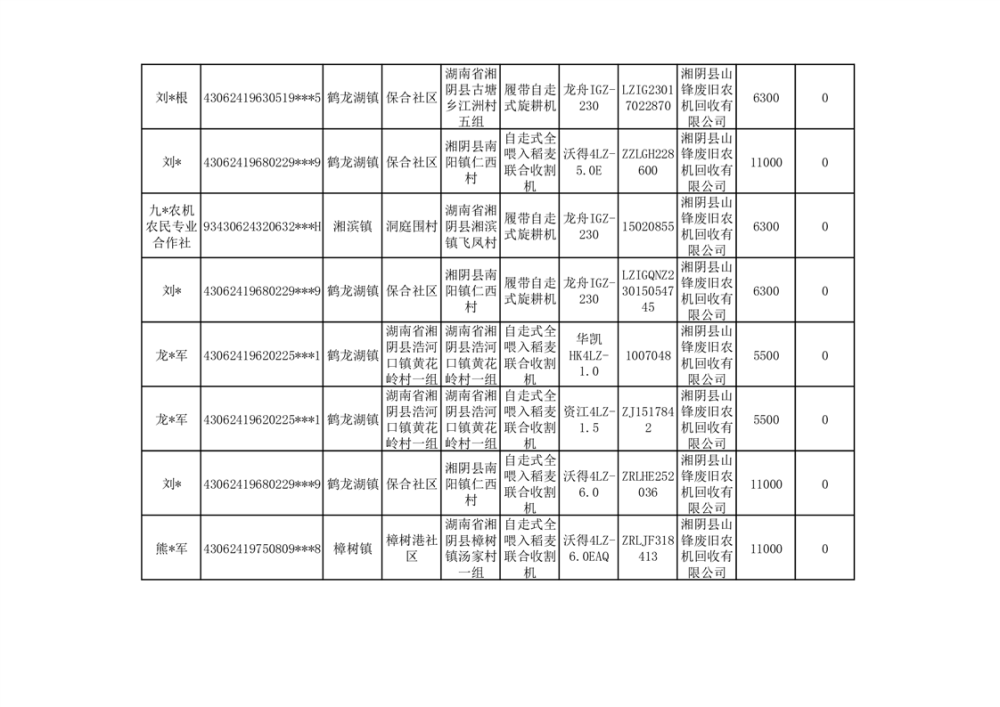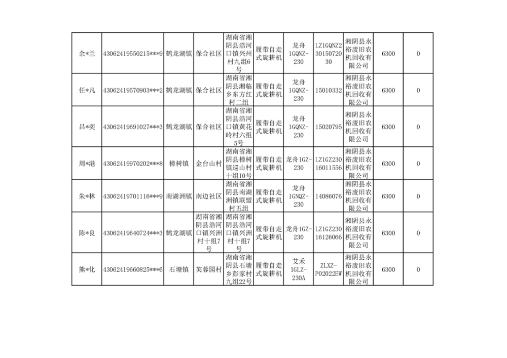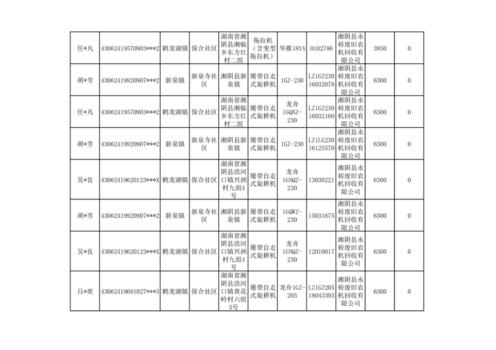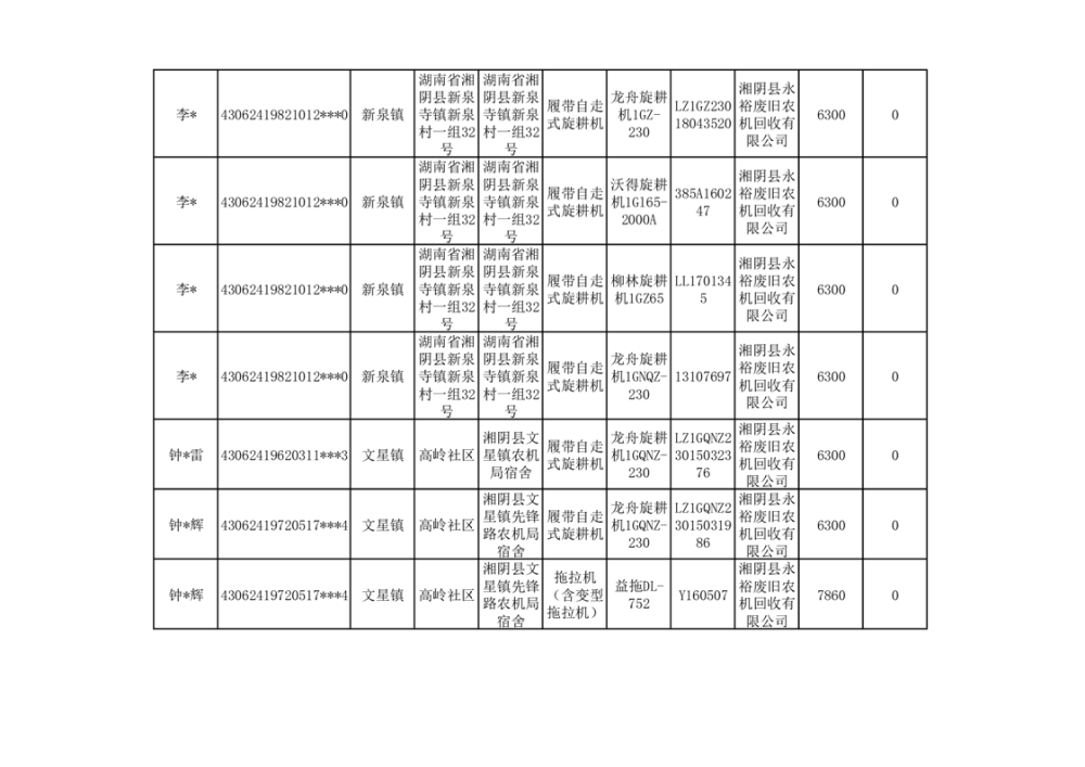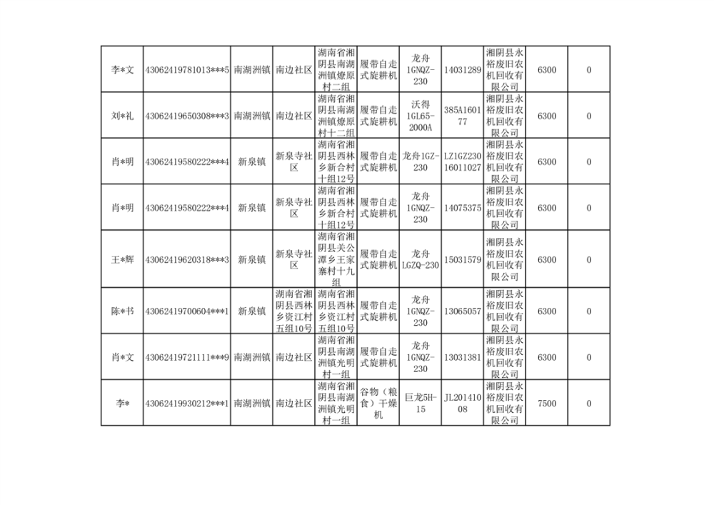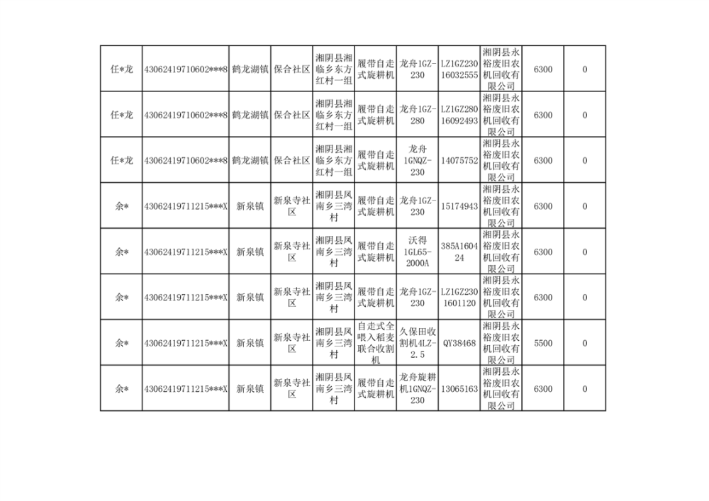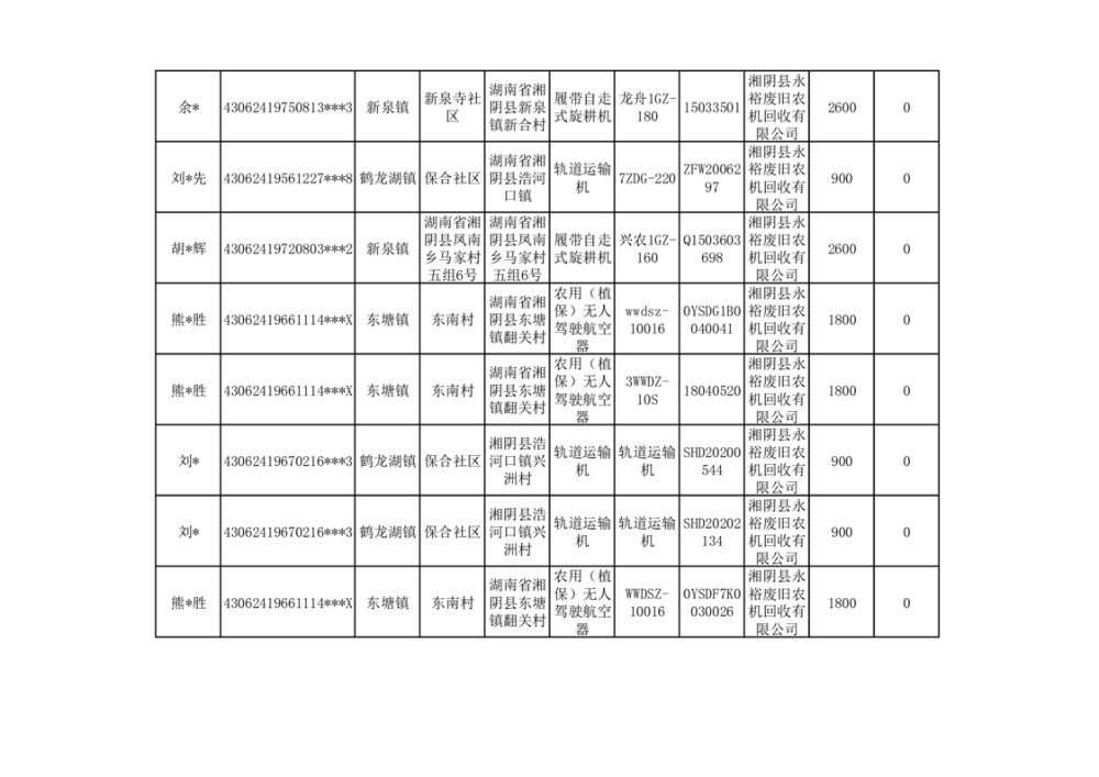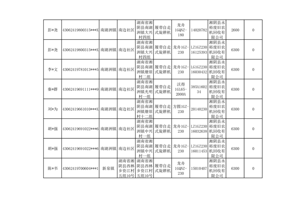 2024年湘阴县农机报废更新补贴资金公示(第三批)