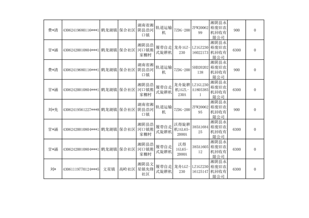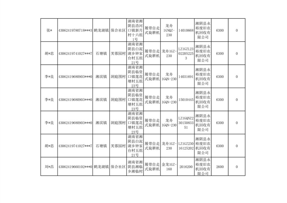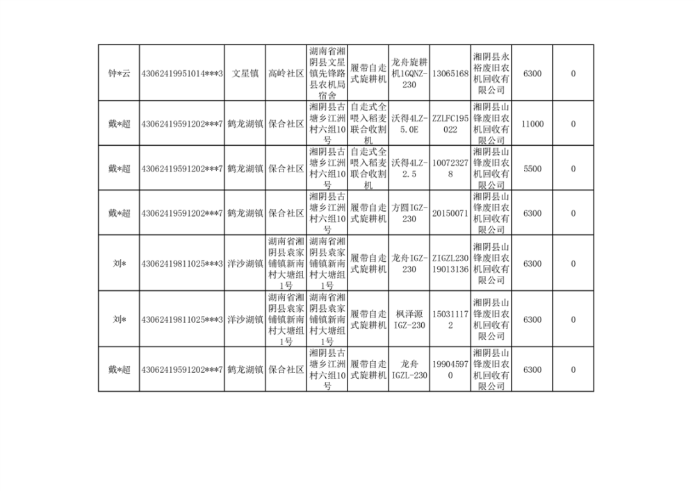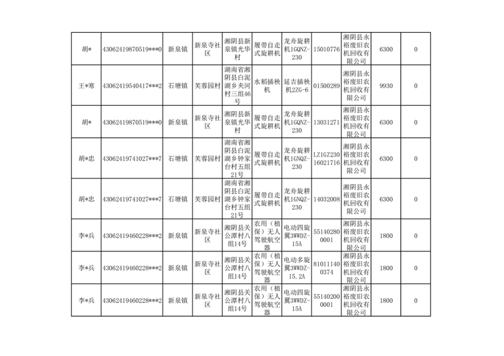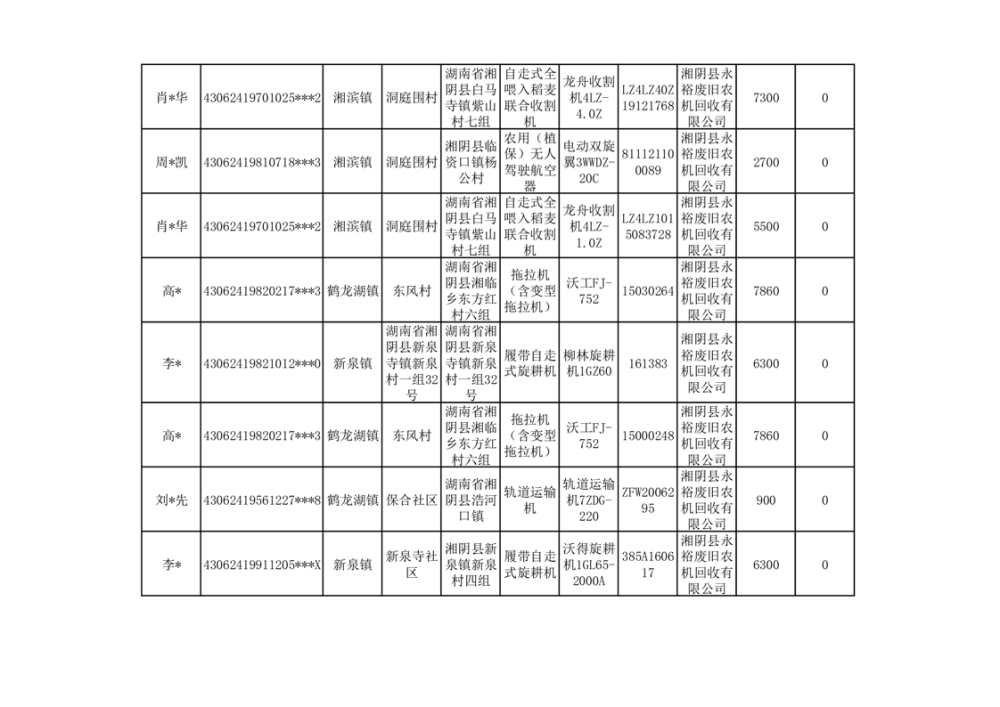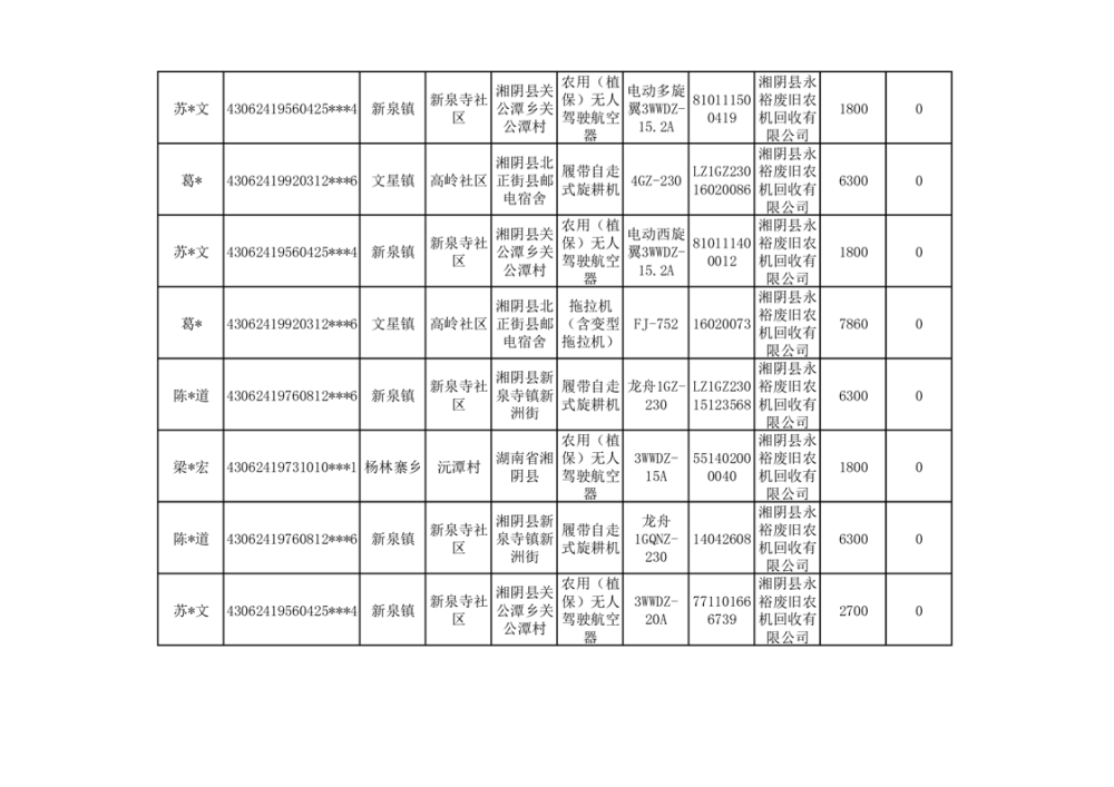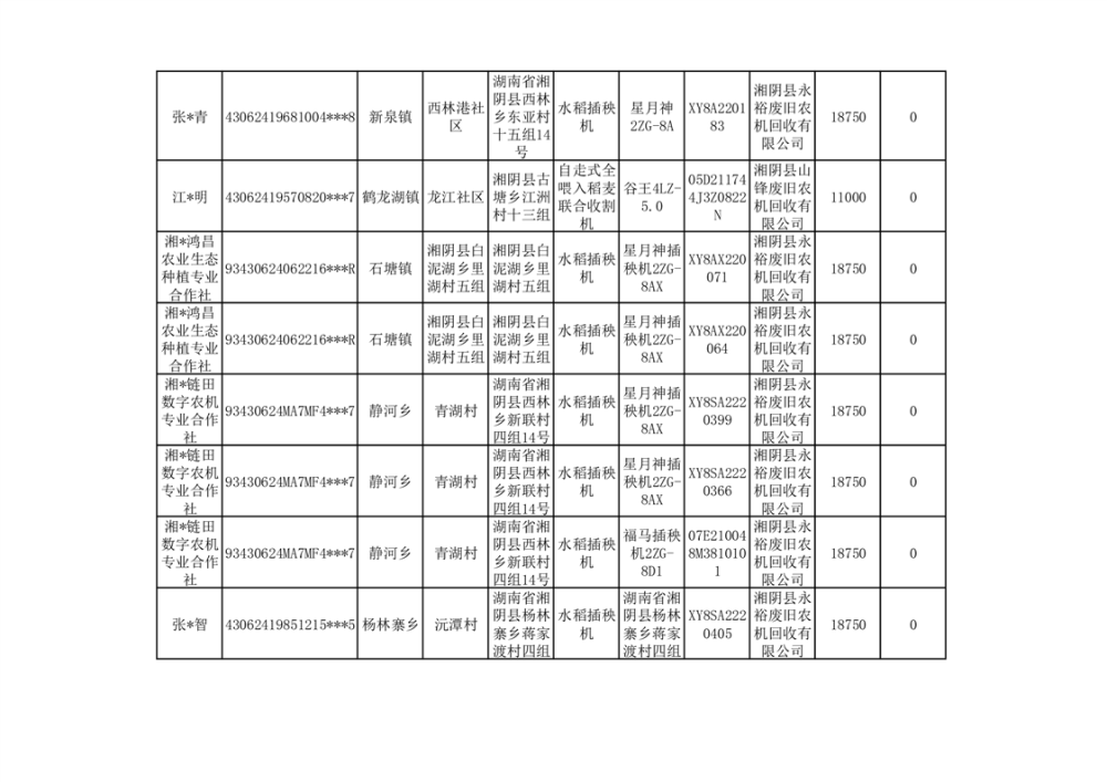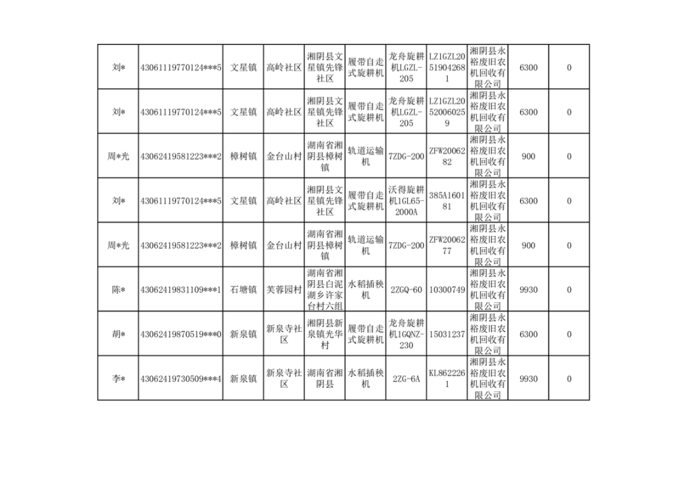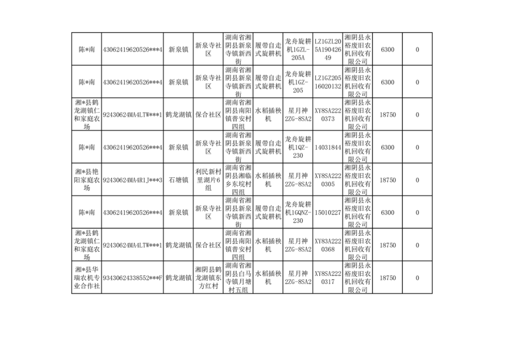 2024年湘阴县农机报废更新补贴资金公示(第三批)