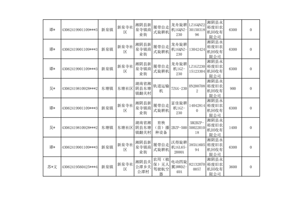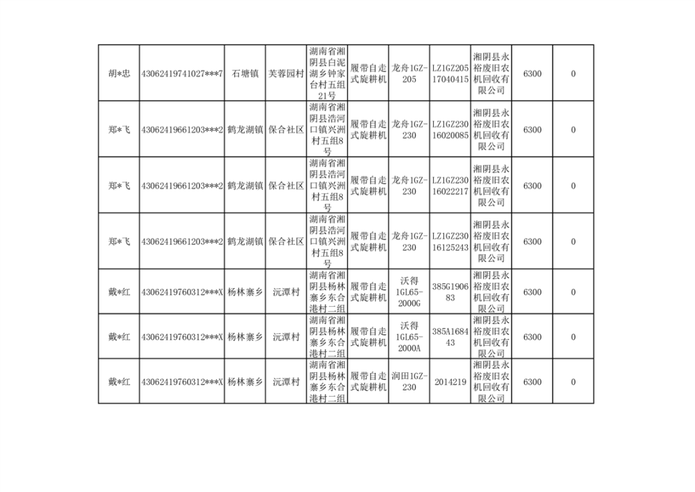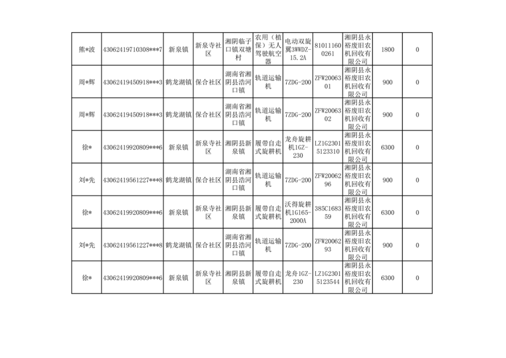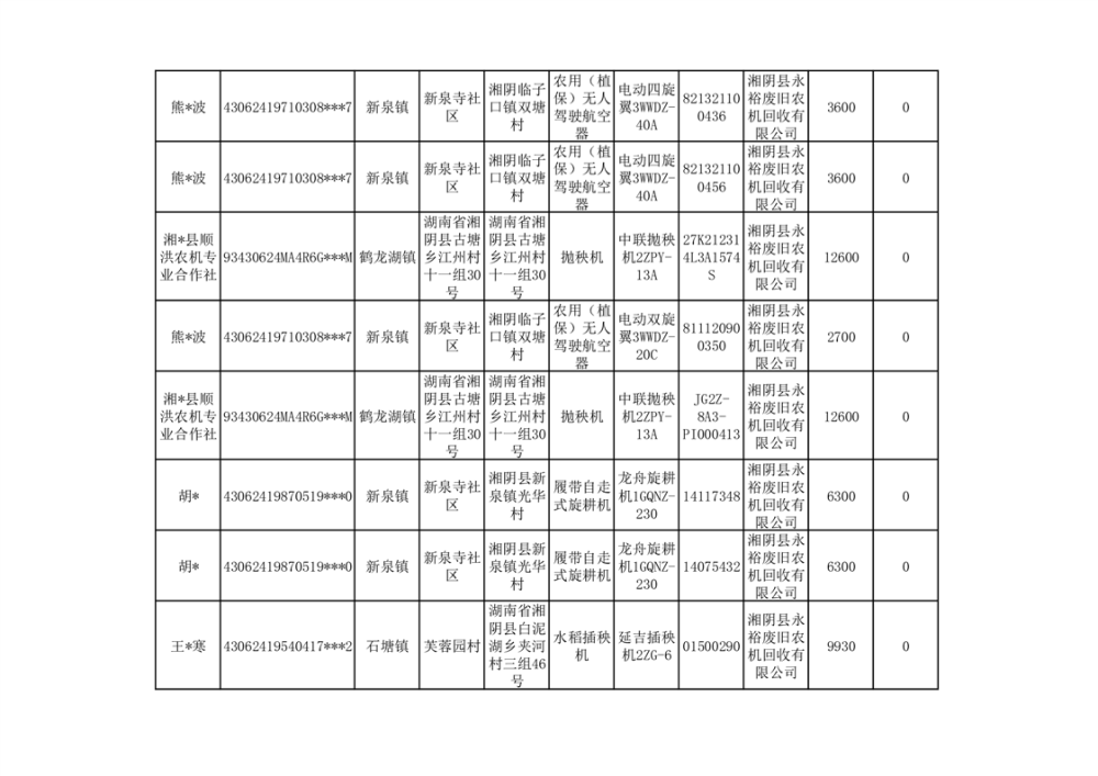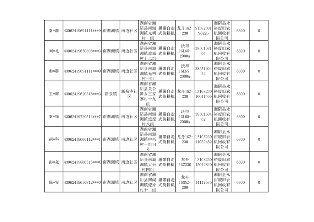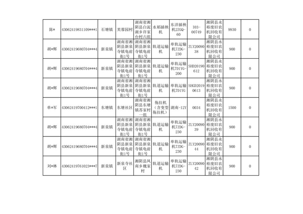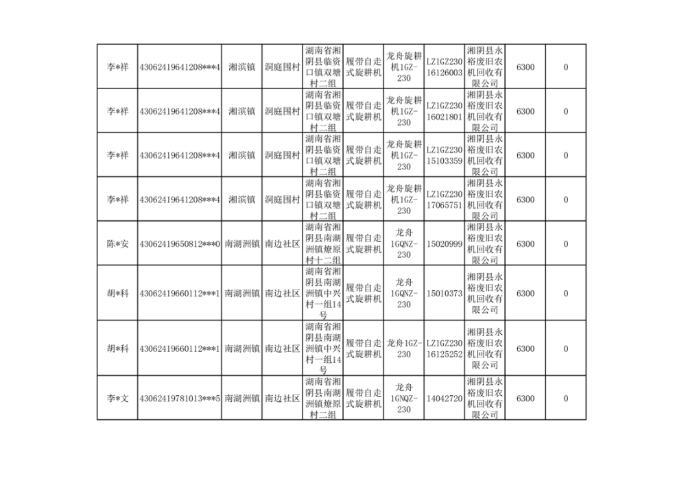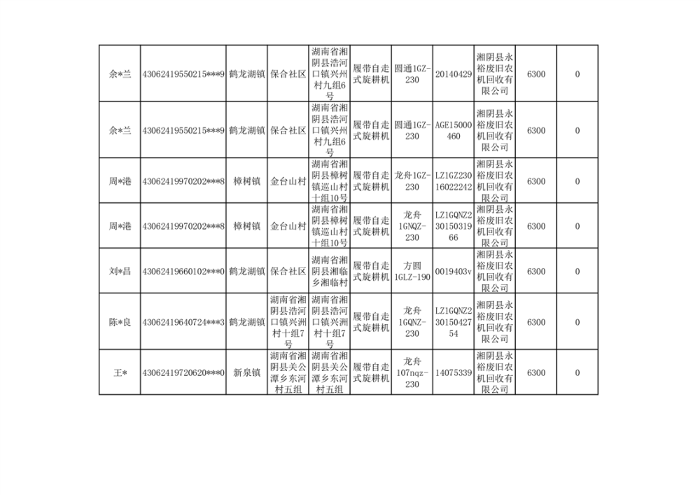 2024年湘阴县农机报废更新补贴资金公示(第三批)