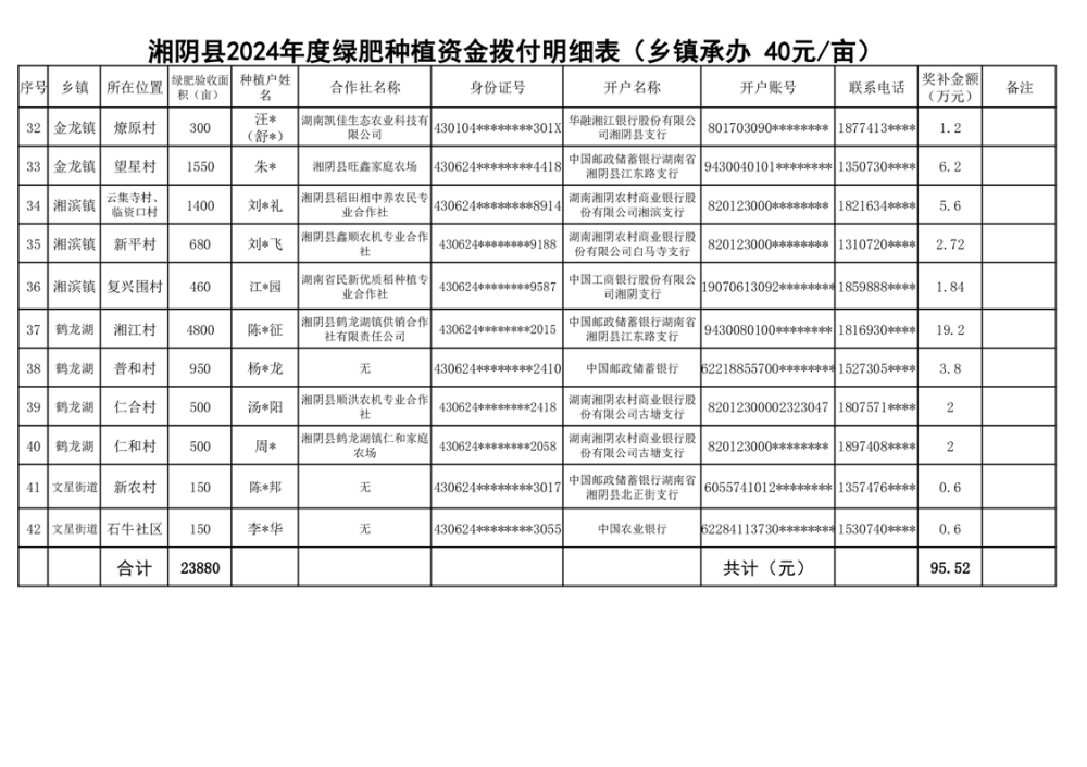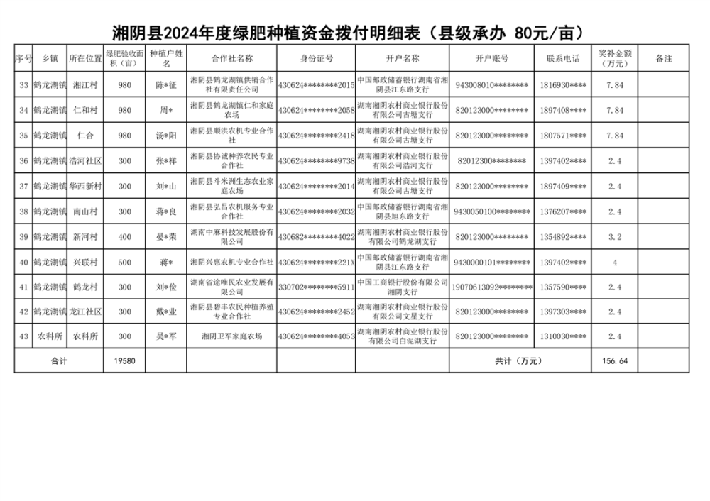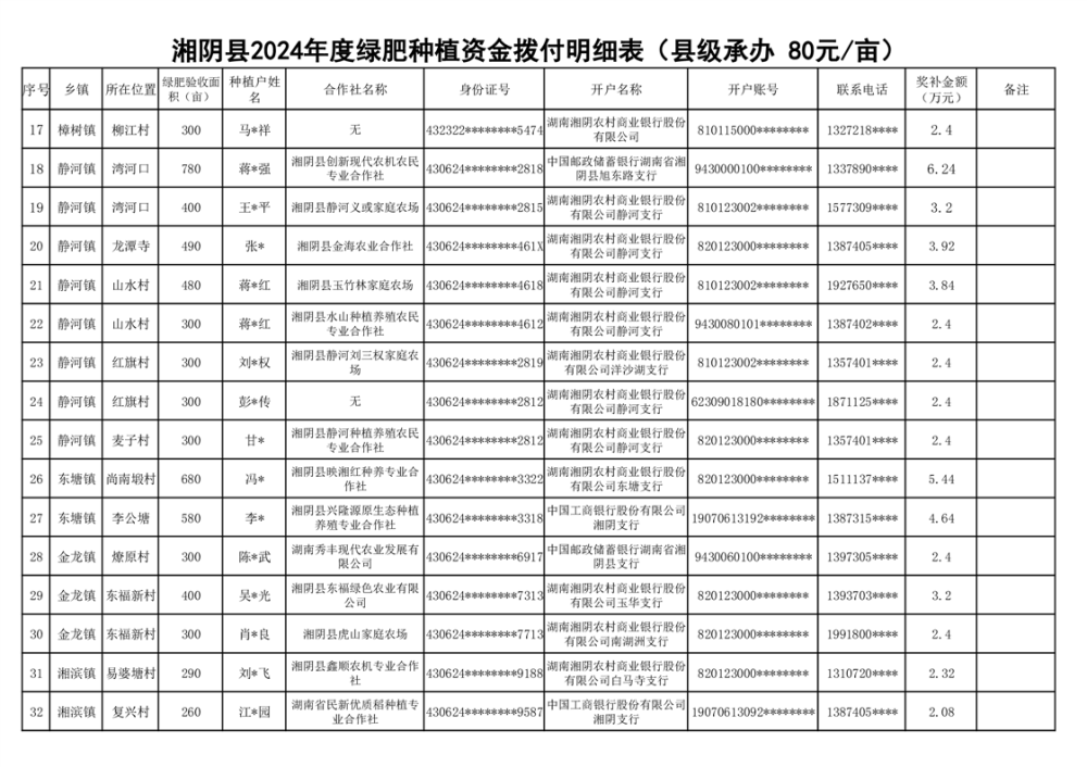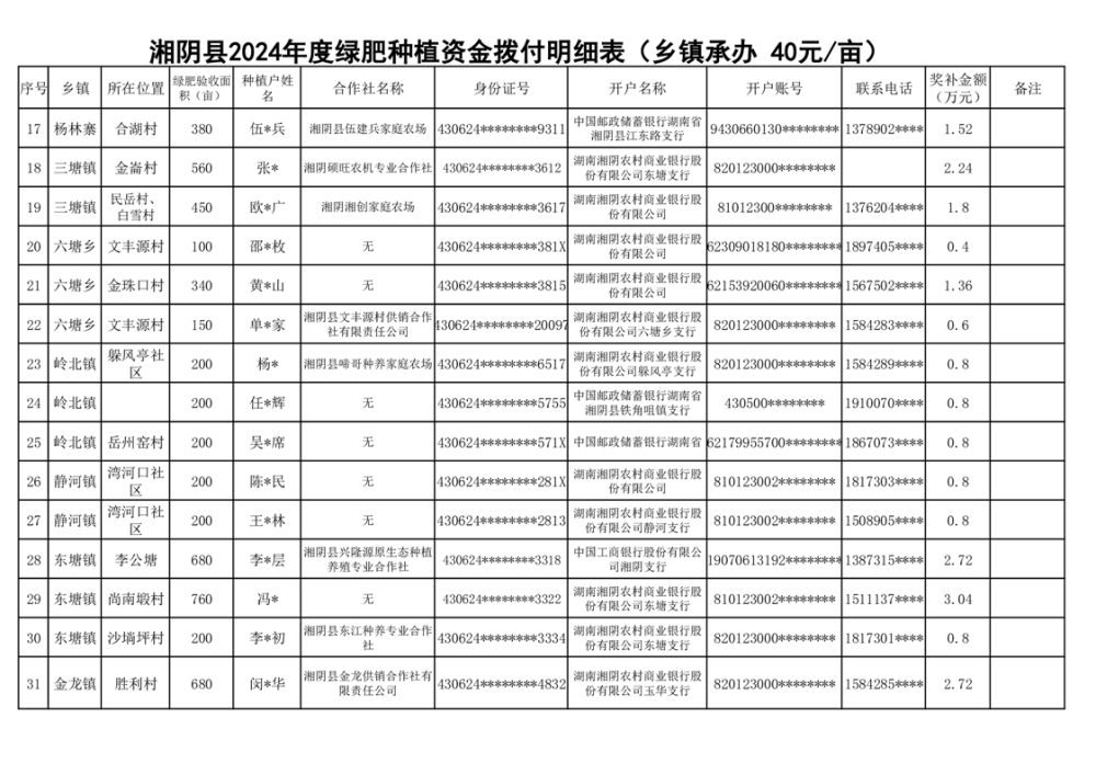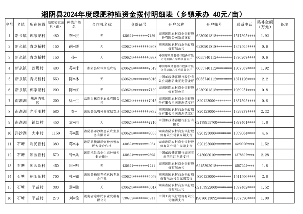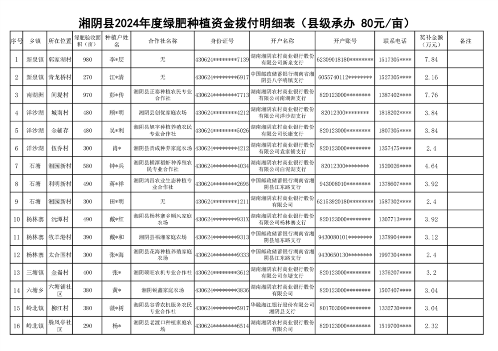 湘阴县2024年受污染耕地安全利用及化肥减量增效绿肥种植实施主体奖补情况公示